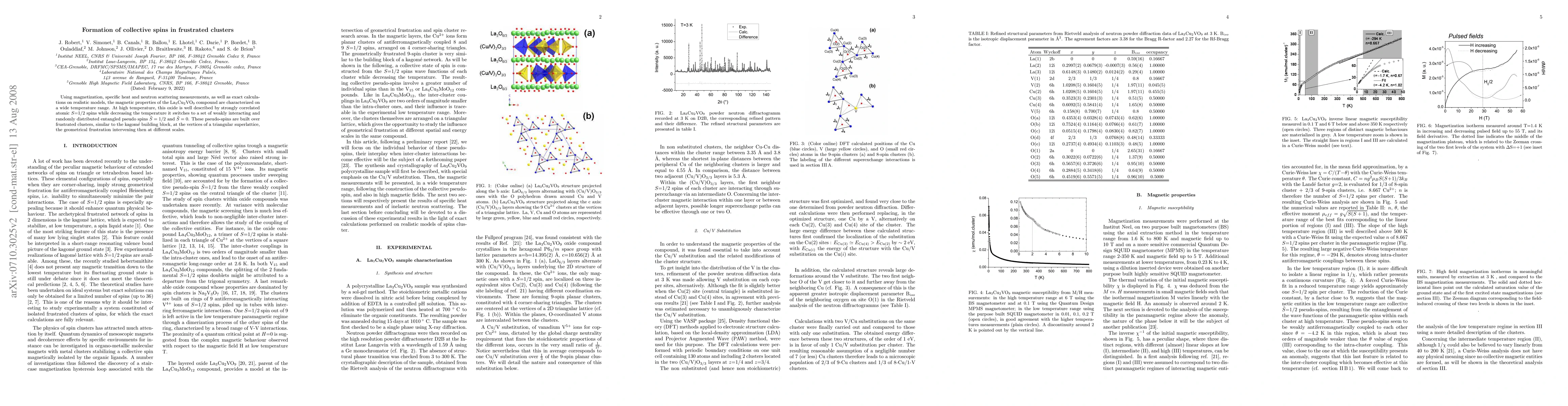 Using magnetization, specific heat and neutron scattering measurements, as well as exact calculations on realistic models, the magnetic properties of the \lacuvo compound are characterized on a wide temperature range. At high temperature, this oxide is well described by strongly correlated atomic $S$=1/2 spins while decreasing the temperature it switches to a set of weakly interacting and randomly distributed entangled pseudo spins $\tilde S=1/2$ and $\tilde S=0$. These pseudo-spins are built over frustrated clusters, similar to the kagom\'e building block, at the vertices of a triangular superlattice, the geometrical frustration intervening then at different scales.
