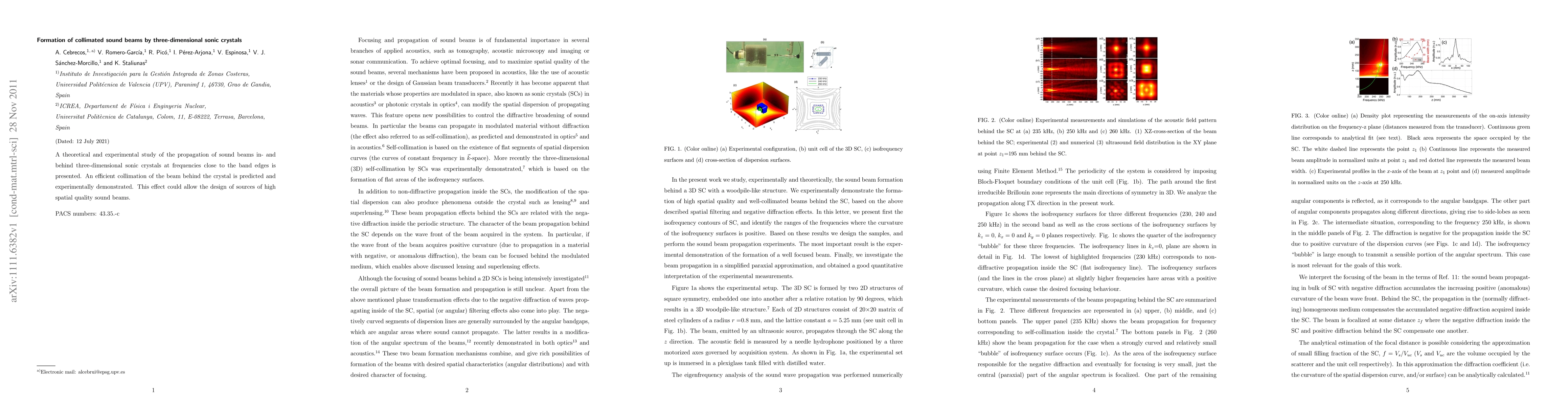 This study presents both theoretical and experimental evidence for the formation of collimated sound beams using three-dimensional sonic crystals near their band edges, demonstrating potential for high-quality sound beam sources. The research validates the efficient collimation of sound beams behind the crystals.
