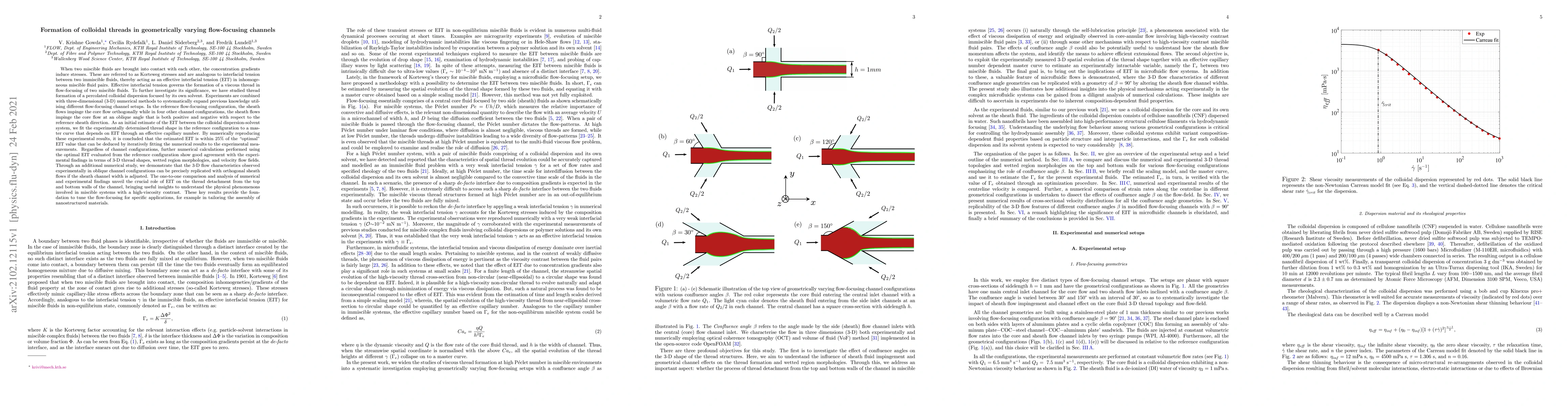 When two miscible fluids are brought into contact with each other, the concentration gradients induce stresses. These are referred to as Korteweg stresses and are analogous to interfacial tension between two immiscible fluids, thereby acting as an effective interfacial tension (EIT) in inhomogeneous miscible systems. EIT governs the formation of a viscous thread in flow-focusing of two miscible fluids. To further investigate its significance, we have studied thread formation of a colloidal dispersion focused by its own solvent. Experiments are combined with three-dimensional numerical models to systematically expand previous knowledge utilising different flow-focusing channel setups. In the reference setup, the sheath flows impinge the core flow orthogonally while in four other channel setups, the sheath flows impinge the core flow at an oblique angle that is both positive and negative with respect to the reference sheath direction. As an initial estimate of the EIT, we fit the experimentally determined thread shape in the reference setup to a master curve that depends on EIT through an effective capillary number. By numerically reproducing these experimental results, it is concluded that the estimated EIT is within 25% of the optimal EIT value that can be deduced by iteratively fitting the numerical results to the experimental measurements. Regardless of channel setups, further numerical calculations performed using the optimal EIT evaluated from the reference setup show good agreement with the experimental findings in terms of thread shapes, wetted region morphologies, and velocity flow fields. The one-to-one comparison of numerical and experimental findings unveil the crucial role of EIT on the thread detachment from the top and bottom walls of the channel, bringing useful insights to understand the physical phenomenons involved in miscible systems with a high-viscosity contrast.
