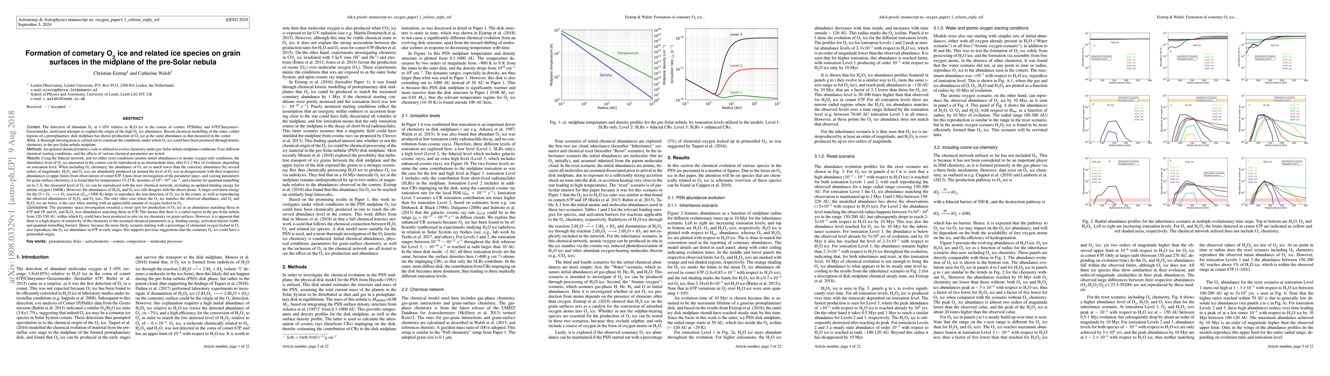 [Abridged] The detection of abundant O$_{2}$ ice at 1-10% with respect to H$_{2}$O ice in the comae of comets 1P/Halley and 67P/Churyumov-Gerasimenko motivated attempts to explain the origin of the high O$_{2}$ ice abundance. Recent chemical modelling of the outer, colder regions of a protoplanetary disk midplane has shown production of O$_{2}$ ice at the same abundance as that measured in the comet. An updated chemical kinetics code is utilised here to evolve chemistry under pre-Solar nebula midplane conditions. Four different chemical starting conditions, and the effects of various chemical parameters are tested. The parameter space investigation revealed a sweet spot for production of O$_{2}$ ice at an abundance matching those in 67P and 1P, and O$_{3}$ and H$_{2}$O$_{2}$ ices abundances matching those in 67P. This means that there is a radial region in the pre-Solar nebula from 120-150 AU, within which O$_{2}$ could have been produced in-situ via ice chemistry on grain surfaces. However, it is apparent that there is a high degree of sensitivity of the chemistry to the assumed chemical parameters (e.g. binding energy, activation barrier width, and quantum tunnelling barrier). Hence, because the more likely scenario starting with a percentage of elemental oxygen locked in O$_{2}$ also reproduces the O$_{2}$ ice abundance in 67P at early stages, this supports previous suggestions that the cometary O$_{2}$ ice could have a primordial origin.