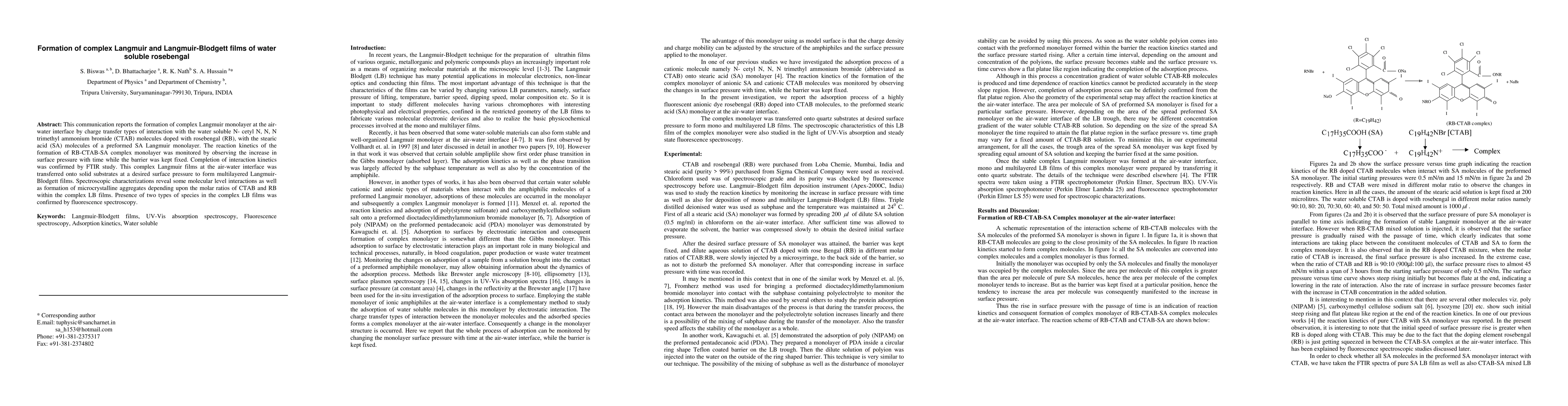 The research investigates the formation of complex Langmuir and Langmuir-Blodgett films using water-soluble rosebengal (RB) doped with N-cetyl N, N, N-trimethyl ammonium bromide (CTAB) molecules, which interact with stearic acid (SA) molecules in a preformed SA Langmuir monolayer. The reaction kinetics were monitored by surface pressure changes over time, and completion was confirmed via FTIR study.