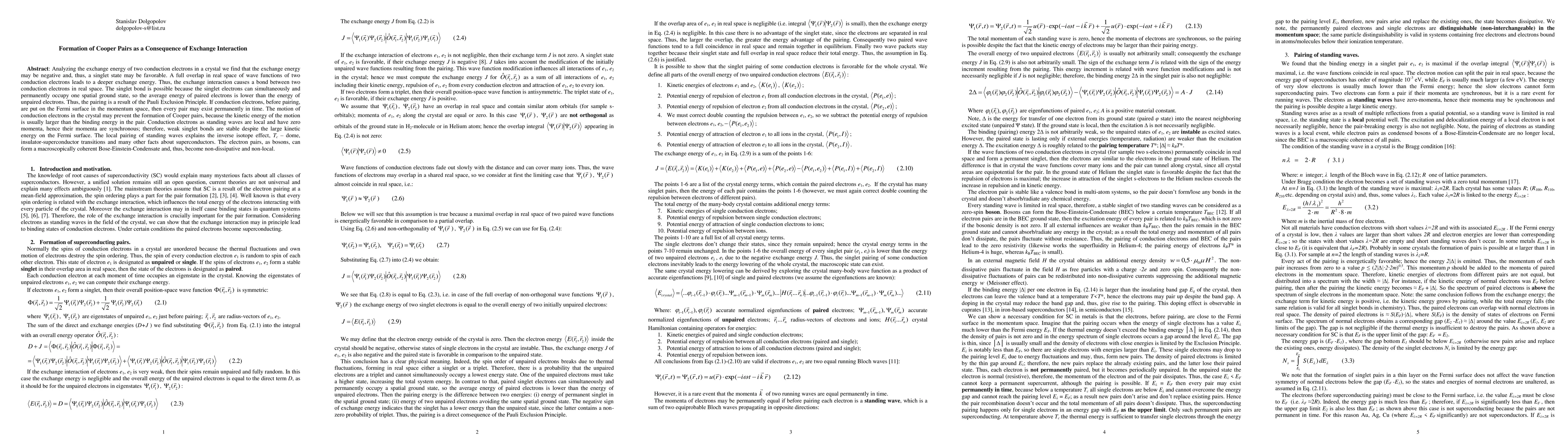 This paper explores how exchange interaction leads to the formation of Cooper pairs in a crystal, driven by the negative exchange energy that favors a singlet state. The local pairing of standing wave electrons, despite high kinetic energy, explains phenomena like the inverse isotope effect and superconductor transitions.