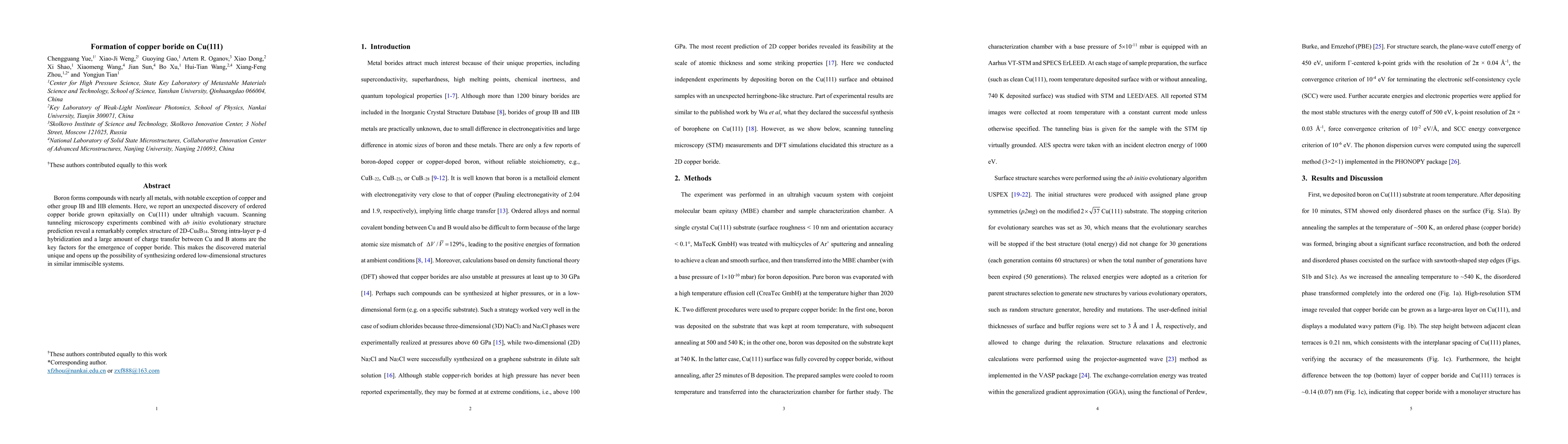 The study reports the unexpected formation of an ordered copper boride, 2D-Cu8B14, epitaxially grown on Cu(111) under ultrahigh vacuum conditions. The complex structure is characterized by strong intra-layer p-d hybridization and significant charge transfer, highlighting the potential for synthesizing similar low-dimensional structures in immiscible metal-boron systems.