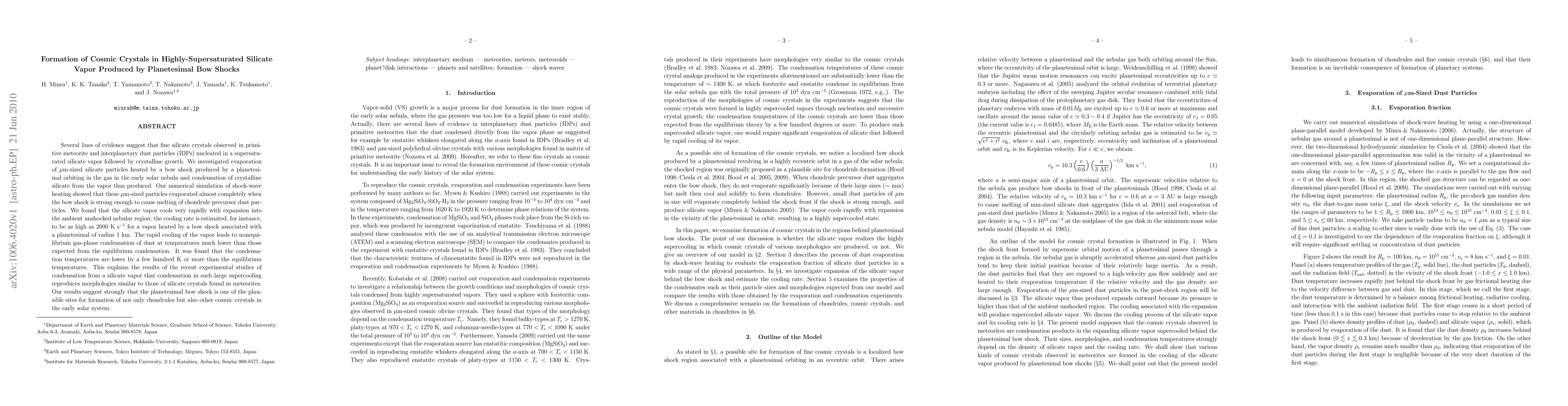 This paper investigates the formation of cosmic crystals in supersaturated silicate vapor through planetesimal bow shocks in the early solar nebula. Numerical simulations show that strong bow shocks can cause rapid cooling and nonequilibrium condensation of silicate vapor, leading to the formation of crystals similar to those found in meteorites.