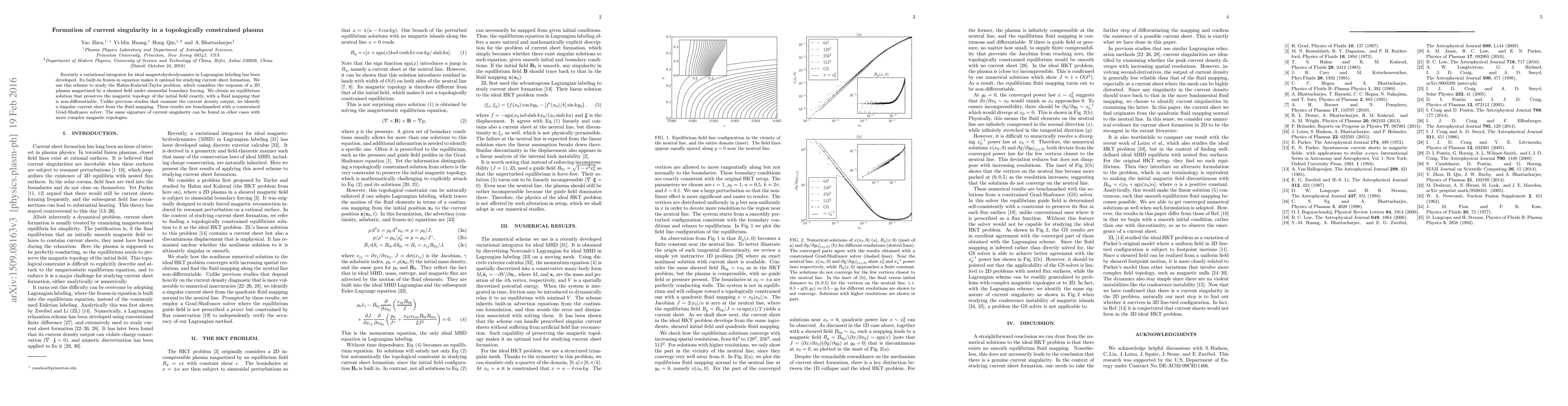 Recently a variational integrator for ideal magnetohydrodynamics in Lagrangian labeling has been developed. Its built-in frozen-in equation makes it optimal for studying current sheet formation. We use this scheme to study the Hahm-Kulsrud-Taylor problem, which considers the response of a 2D plasma magnetized by a sheared field under sinusoidal boundary forcing. We obtain an equilibrium solution that preserves the magnetic topology of the initial field exactly, with a fluid mapping that is non-differentiable. Unlike previous studies that examine the current density output, we identify a singular current sheet from the fluid mapping. These results are benchmarked with a constrained Grad-Shafranov solver. The same signature of current singularity can be found in other cases with more complex magnetic topologies.