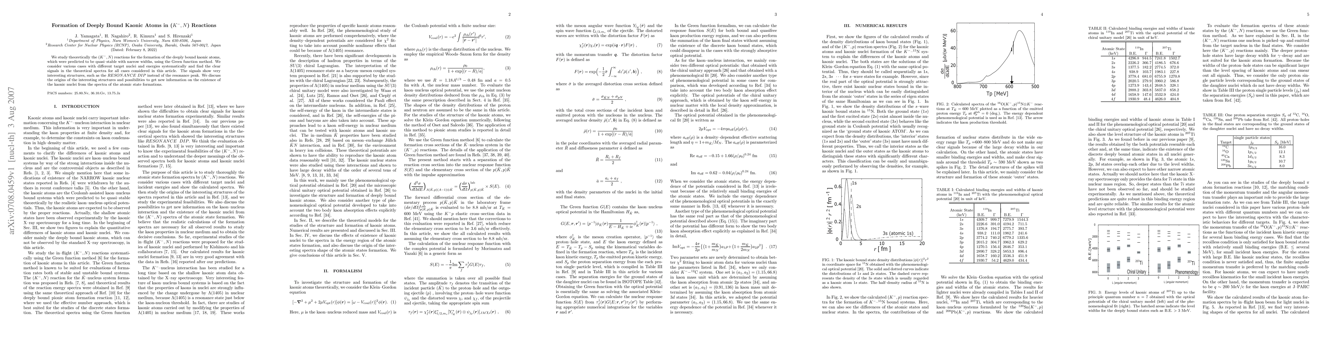 This paper explores the formation of deeply bound kaonic atoms via (K^-,N) reactions using the Green function method, finding quasi-stable structures with narrow widths. It reveals unique spectral features, including a "RESONANCE DIP," suggesting new insights into the existence of kaonic nuclei.