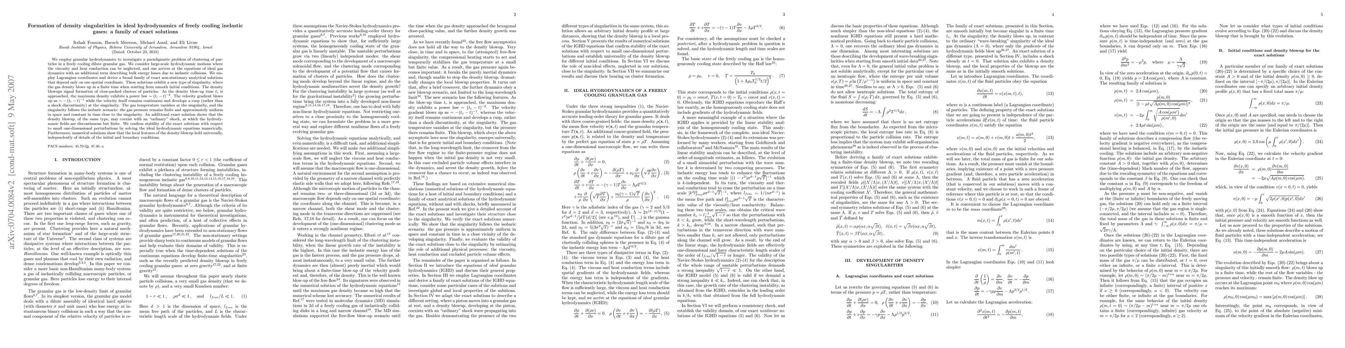 This paper presents exact analytical solutions for the ideal hydrodynamics of freely cooling inelastic gases, revealing the formation of density singularities where gas density blows up in finite time. These singularities signal the emergence of close-packed particle clusters, with density and velocity gradient exhibiting specific power-law behaviors as the singularity is approached.