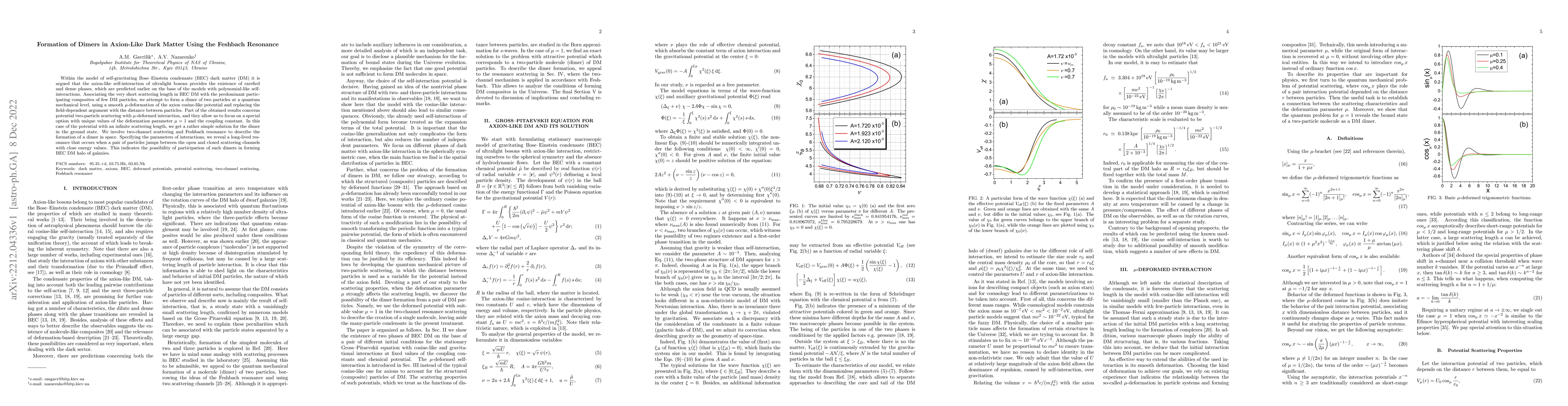 Within the model of self-gravitating Bose--Einstein condensate (BEC) dark matter (DM) it is argued that the axion-like self-interaction of ultralight bosons provides the existence of rarefied and dense phases, which are predicted earlier on the base of the models with polynomial-like self-interactions. Associating the very short scattering length in BEC DM with the predominant participating composites of few DM particles, we attempt to form a dimer of two particles at a quantum mechanical level, using a smooth $\mu$-deformation of the axion cosine-like potential and replacing the field-dependent argument with the distance between particles. Part of the obtained results concerns potential two-particle scattering with $\mu$-deformed interaction, and they allow us to focus on a special option with unique values of the deformation parameter $\mu=1$ and the coupling constant. In this case of the potential with an infinite scattering length, we get a rather simple solution for the dimer in the ground state. We involve two-channel scattering and Feshbach resonance to describe the formation of a dimer in space. Specifying the parameters of interactions, we reveal a long-lived resonance that occurs when a pair of particles jumps between the open and closed scattering channels with close energy values. This indicates the possibility of participation of such dimers in forming BEC DM halo of galaxies.