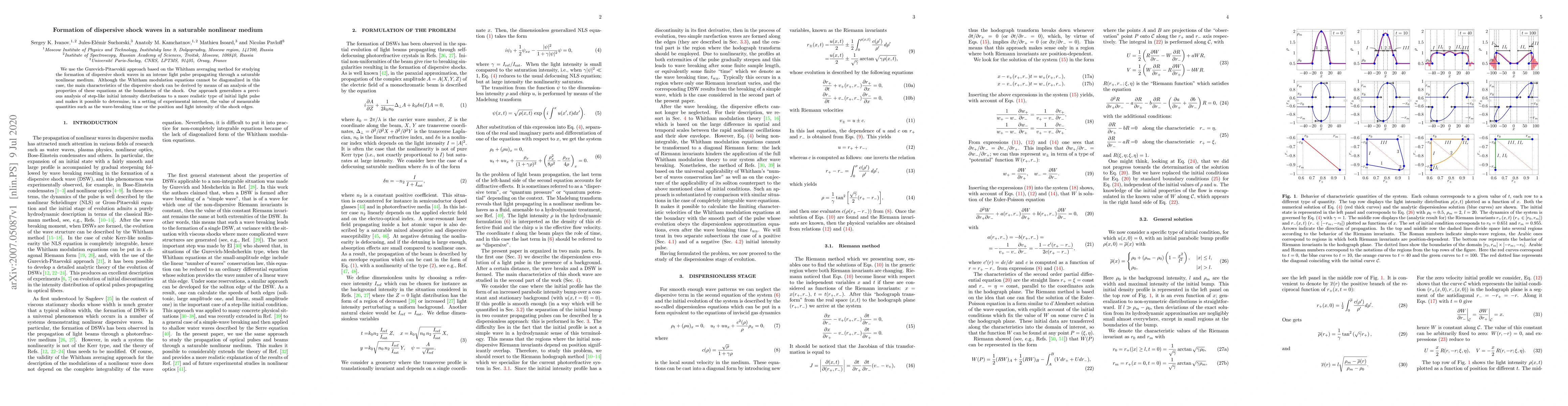 We use the Gurevich-Pitaevskii approach based on the Whitham averaging method for studying the formation of dispersive shock waves in an intense light pulse propagating through a saturable nonlinear medium. Although the Whitham modulation equations cannot be diagonalized in this case, the main characteristics of the dispersive shock can be derived by means of an analysis of the properties of these equations at the boundaries of the shock. Our approach generalizes a previous analysis of step-like initial intensity distributions to a more realistic type of initial light pulse and makes it possible to determine, in a setting of experimental interest, the value of measurable quantities such as the wave-breaking time or the position and light intensity of the shock edges.