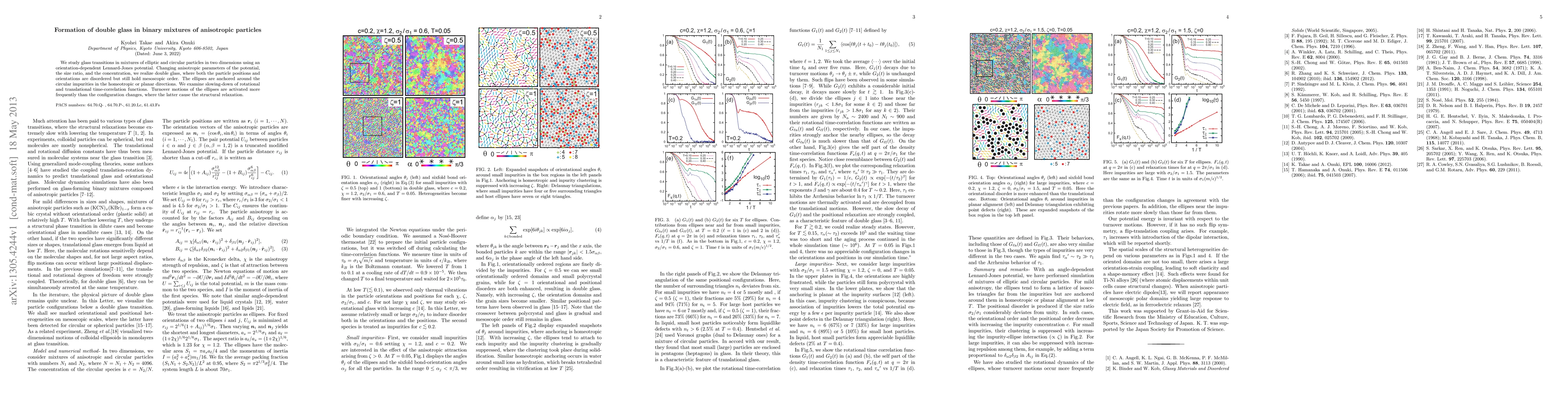 This paper investigates glass transitions in binary mixtures of elliptic and circular particles using an orientation-dependent potential. It reveals the formation of double glass, characterized by disordered particle positions and orientations with mesoscopic order, and examines the slowing-down of rotational and translational dynamics.