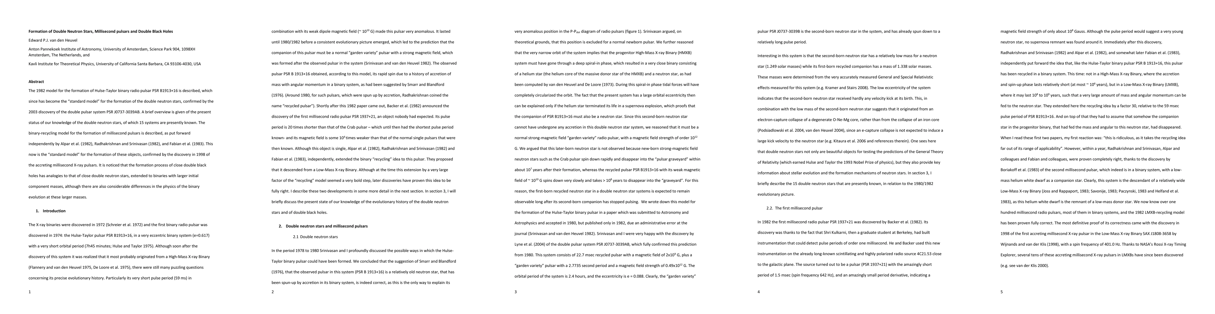 This paper reviews the standard models for the formation of double neutron stars, millisecond pulsars, and double black holes, highlighting the Hulse-Taylor binary radio pulsar PSR B1913+16 and the binary-recycling model, with recent discoveries confirming these models and noting similarities and differences in the formation processes of double neutron stars and black holes.