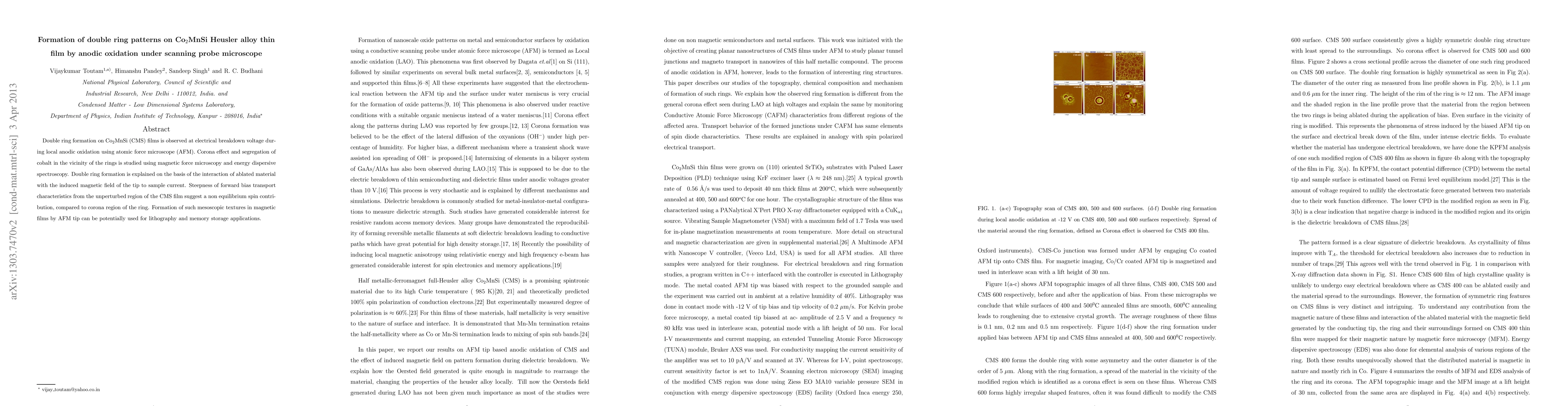 Double ring formation on Co2MnSi (CMS) films is observed at electrical breakdown voltage during local anodic oxidation (LAO) using atomic force microscope (AFM). Corona effect and segregation of cobalt in the vicinity of the rings is studied using magnetic force microscopy and energy dispersive spectroscopy. Double ring forma-tion is attributed to the interaction of ablated material with the induced magnetic field during LAO. Steepness of forward bias transport characteristics from the unperturbed region of the CMS film suggest a non equilibrium spin contribution. Such mesoscopic textures in magnetic films by AFM tip can be potentially used for memory storage applications.