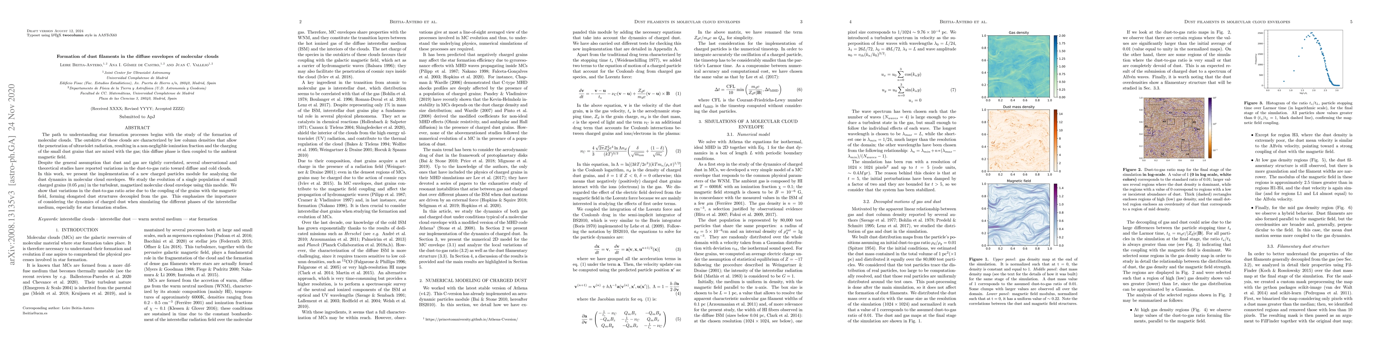 This paper introduces a new module to analyze charged dust dynamics in molecular cloud envelopes, revealing that magnetic field coupling leads to the formation of dust filaments, which can decouple from the gas, highlighting the significance of charged dust dynamics in star formation processes.