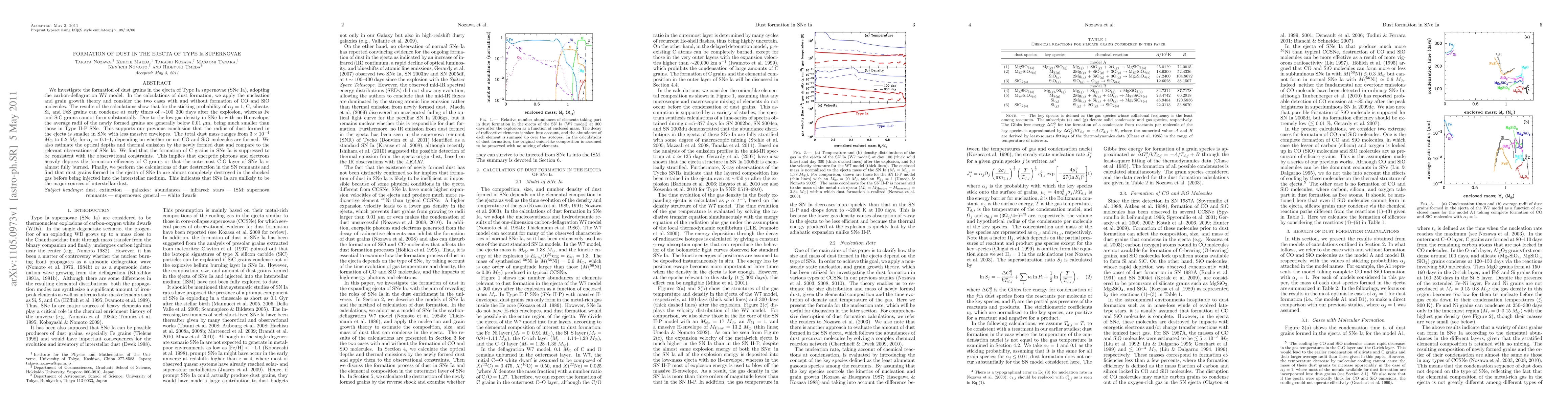 This study explores dust grain formation in Type Ia supernova ejecta using the carbon-deflagration W7 model, finding that C, silicate, Si, and FeS grains form early but Fe and SiC grains do not. Dust grains are small due to low gas density, and dust mass ranges from 3x10^{-4} M_sun to 0.2 M_sun. The formation of C grains is suppressed, suggesting they are mostly destroyed before contributing to interstellar dust.