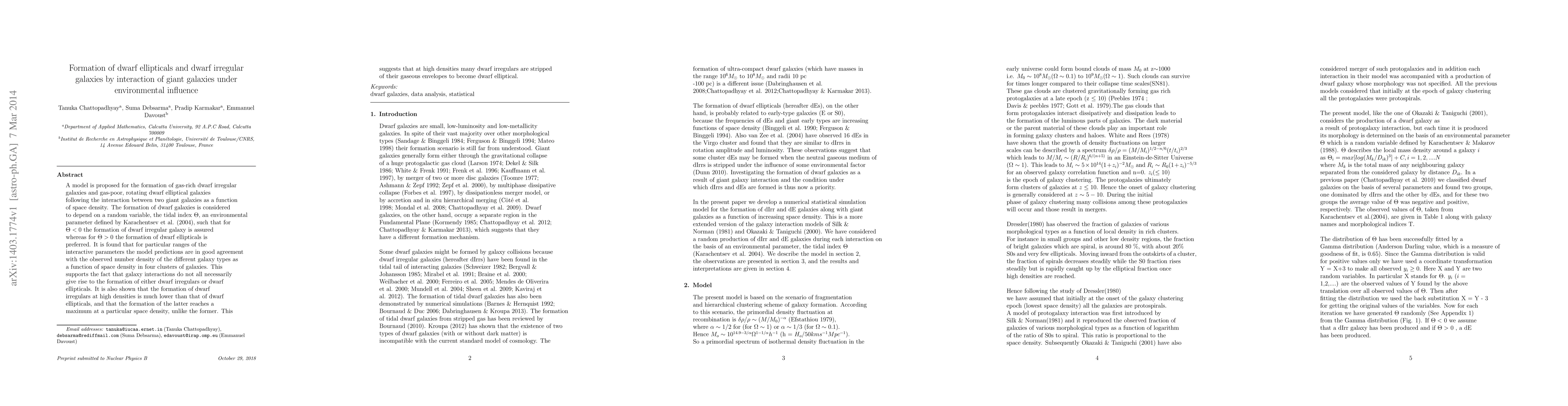 A model is proposed for the formation of gas-rich dwarf irregular galaxies and gas-poor, rotating dwarf elliptical galaxies following the interaction between two giant galaxies as a function of space density. The formation of dwarf galaxies is considered to depend on a random variable, the tidal index theta, an environmental parameter defined by Karachentsev et al. (2004), such that for theta less than zero, the formation of dwarf irregular galaxy is assured whereas for theta greater than zero, the formation of dwarf ellipticals is preferred. It is found that for particular ranges of the interactive parameters the model predictions are in good agreement with the observed number density of the different galaxy types as a function of space density in four clusters of galaxies. This supports the fact that galaxy interactions do not all necessarily give rise to the formation of either dwarf irregulars or dwarf ellipticals. It is also shown that the formation of dwarf irregulars at high densities is much lower than that of dwarf ellipticals, and that the formation of the latter reaches a maximum at a particular space density, unlike the former. This suggests that at high densities many dwarf irregulars are stripped of their gaseous envelopes to become dwarf elliptical.