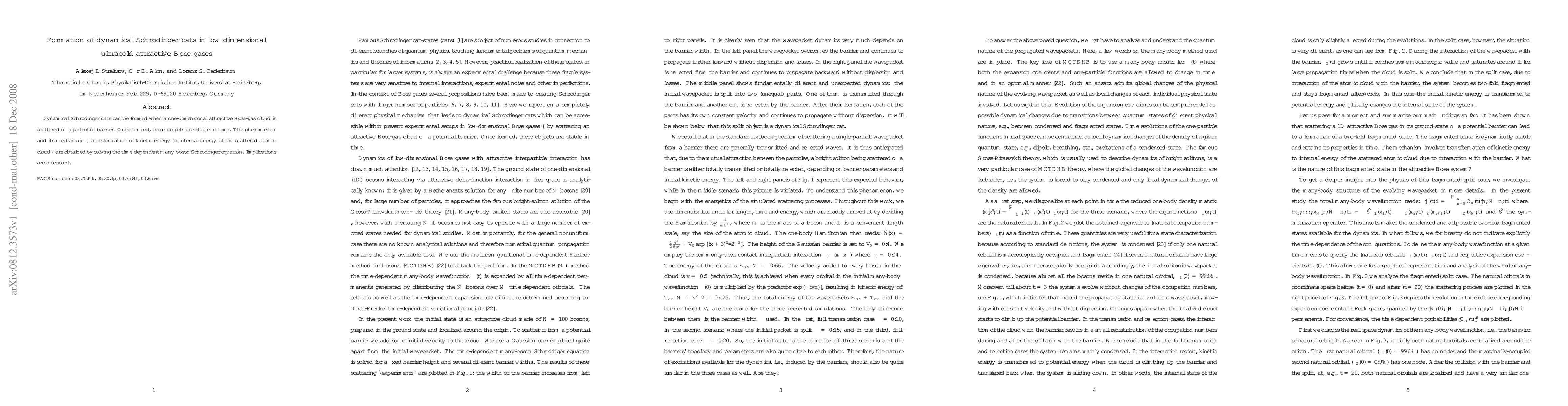 This paper investigates the formation of dynamical Schrödinger cats in low-dimensional ultracold attractive Bose gases when scattered off a potential barrier, demonstrating their stability through the transformation of kinetic to internal energy, solved via the time-dependent many-boson Schrödinger equation. Implications of this phenomenon are also discussed.