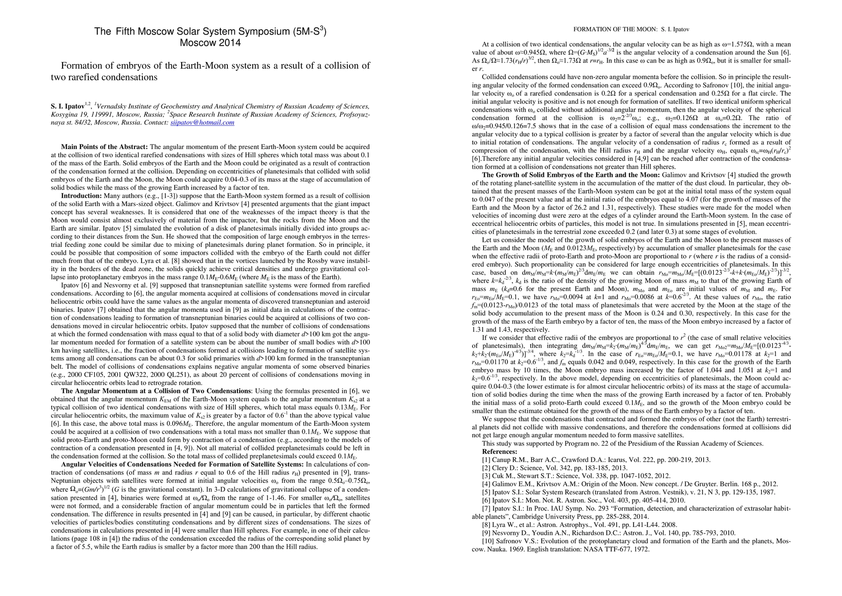The angular momentum of the present Earth-Moon system could be acquired at the collision of two identical rarefied condensations with sizes of Hill spheres which total mass was about 0.1 of the mass of the Earth. Solid embryos of the Earth and the Moon could be originated as a result of contraction of the condensation formed at the collision. Depending on eccentricities of planetesimals that collided with solid embryos of the Earth and the Moon, the Moon could acquire 0.04-0.3 of its mass at the stage of accumulation of solid bodies while the mass of the growing Earth increased by a factor of ten.
