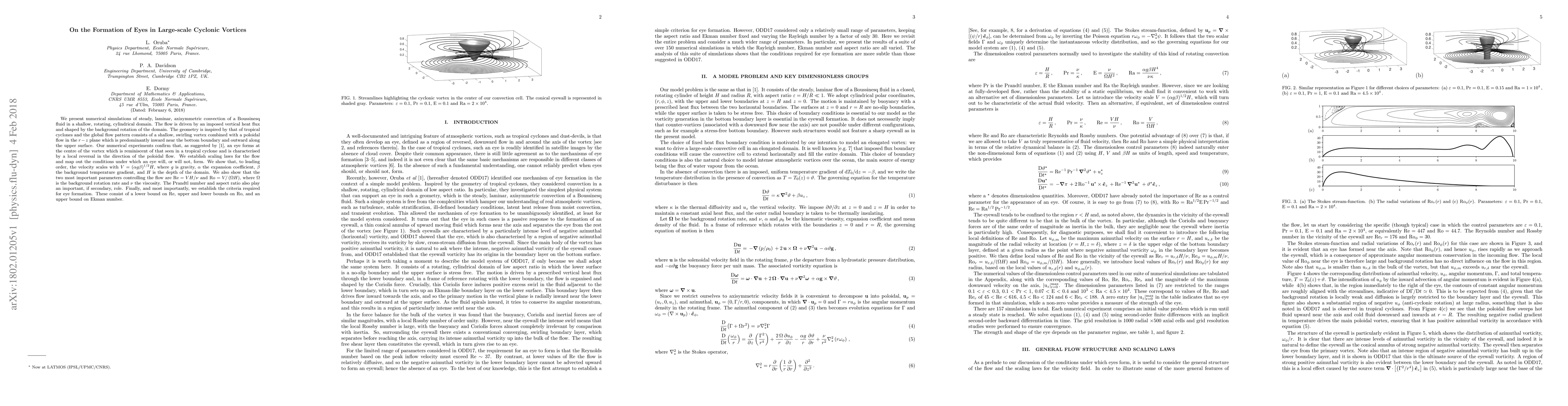 We present numerical simulations of steady, laminar, axisymmetric convection of a Boussinesq fluid in a shallow, rotating, cylindrical domain. The flow is driven by an imposed vertical heat flux and shaped by the background rotation of the domain. The geometry is inspired by that of tropical cyclones and the global flow pattern consists of a shallow, swirling vortex combined with a poloidal flow in the r-z plane which is predominantly inward near the bottom boundary and outward along the upper surface. Our numerical experiments confirm that, as suggested by Oruba et al 2017, an eye forms at the centre of the vortex which is reminiscent of that seen in a tropical cyclone and is characterised by a local reversal in the direction of the poloidal flow. We establish scaling laws for the flow and map out the conditions under which an eye will, or will not, form. We show that, to leading order, the velocity scales with V=(\alpha g \beta)^{1/2}H, where g is gravity, \alpha the expansion coefficient, \beta the background temperature gradient, and H is the depth of the domain. We also show that the two most important parameters controlling the flow are Re=VH/\nu and Ro=V/\Omega H, where \Omega is the background rotation rate and \nu the viscosity. The Prandtl number and aspect ratio also play an important, if secondary, role. Finally, and most importantly, we establish the criteria required for eye formation. These consist of a lower bound on Re, upper and lower bounds on Ro, and an upper bound on Ekman number.