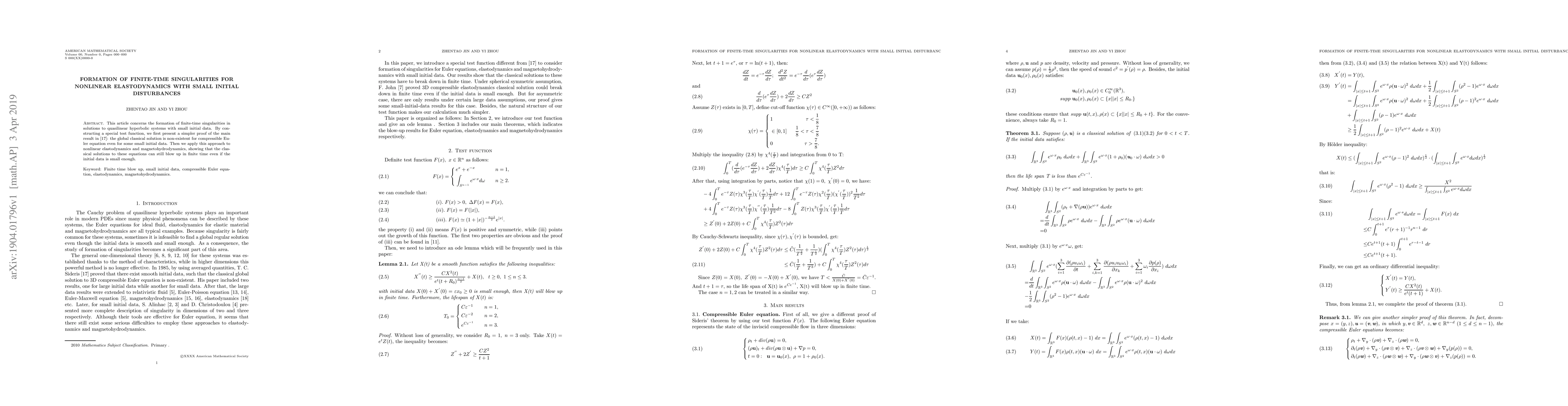 This paper proves the formation of finite-time singularities in quasilinear hyperbolic systems, including nonlinear elastodynamics and magnetohydrodynamics, even with small initial disturbances. The study builds on Sideris' work, demonstrating that classical solutions can blow up in finite time despite minimal initial data.