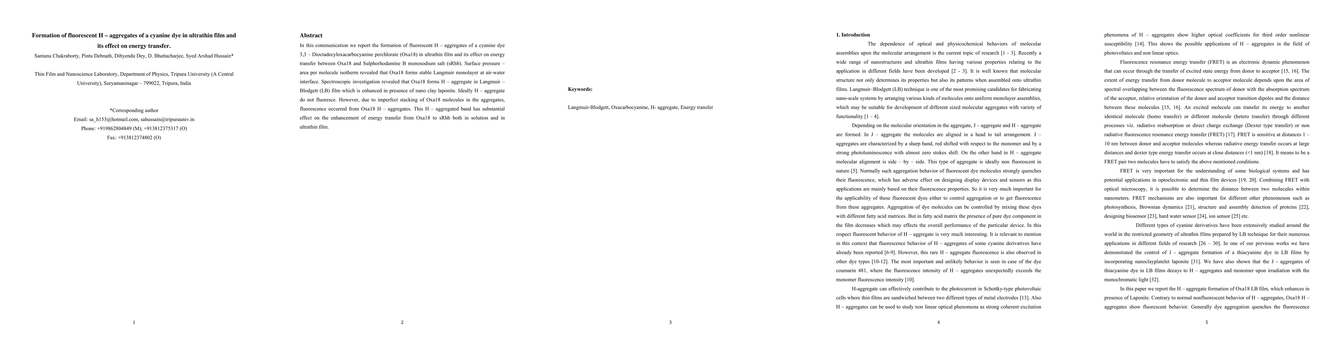 Here we report the formation of fluorescent H aggregates of a cyanine dye Oxa18 in ultrathin film and its effect on energy transfer between Oxa18 and sRhb. Ideally H aggregate do not fluoresce. However, due to imperfect stacking of Oxa18 molecules in the aggregates, fluorescence occurred from Oxa18 H aggregates. This H aggregated band has substantial effect on the enhancement of energy transfer from Oxa18 to sRhb both in solution and in ultrathin film.