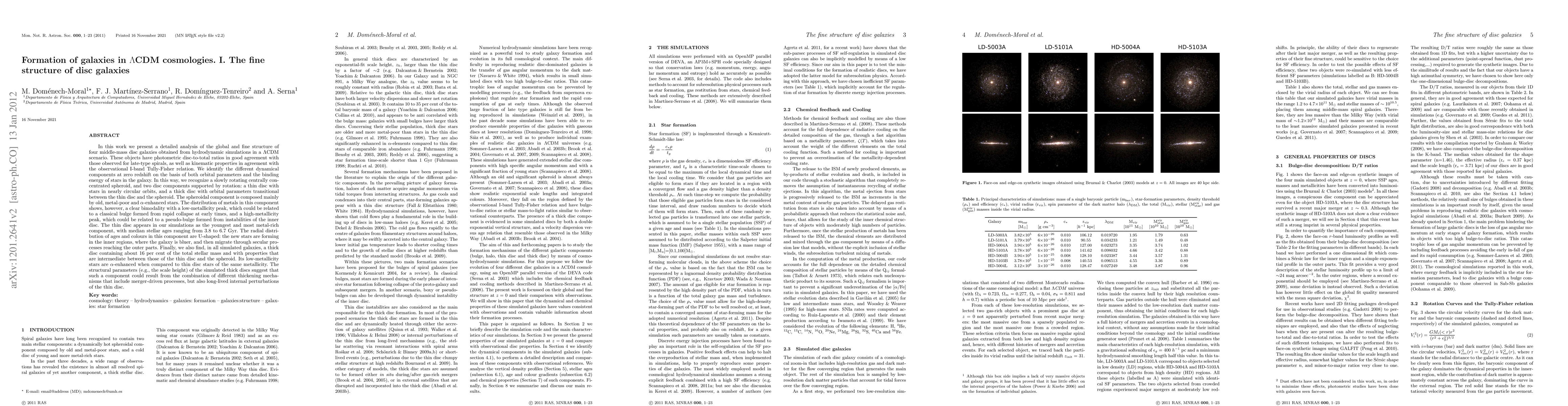 We present a detailed analysis of the global and fine structure of four middle-mass disc galaxies obtained from simulations in a $\Lambda$CDM scenario. These objects have photometric D/T ratios in good agreement with those observed for late-type spirals, as well as kinematic properties in agreement with the observational Tully-Fisher relation. We identify the different dynamical components at z=0 on the basis of both orbital parameters and the binding energy of stars in the galaxy. In this way, we recognize a slowly rotating centrally concentrated spheroid, and two disc components supported by rotation: a thin disc with stars in nearly circular orbits, and a thick disc with orbital parameters transitional between the thin disc and the spheroid. The spheroidal component is composed mainly by old, metal-poor and {\alpha}-enhanced stars. The distribution of metals in this component shows, however, a clear bimodality with a low-metallicity peak, which could be related to a classical bulge, and a high-metallicity peak, which could be related to a pseudo-bulge. The thin disc appears in our simulations as the youngest and most metal-rich component. The radial distribution of ages and colours in this component are U-shaped: the new stars are forming in the inner regions, and then migrate through secular processes. Finally, we also find a thick disc containing about 16% of the total stellar mass and with properties that are intermediate between those of the thin disc and the spheroid. Its low-metallicity stars are {\alpha}-enhanced when compared to thin disc stars of the same metallicity. The structural parameters (e.g., the scale height) of the simulated thick discs suggest that such a component could result from the combination of different thickening mechanisms that include merger-driven processes, but also long-lived internal perturbations of the thin disc. [Abridged]