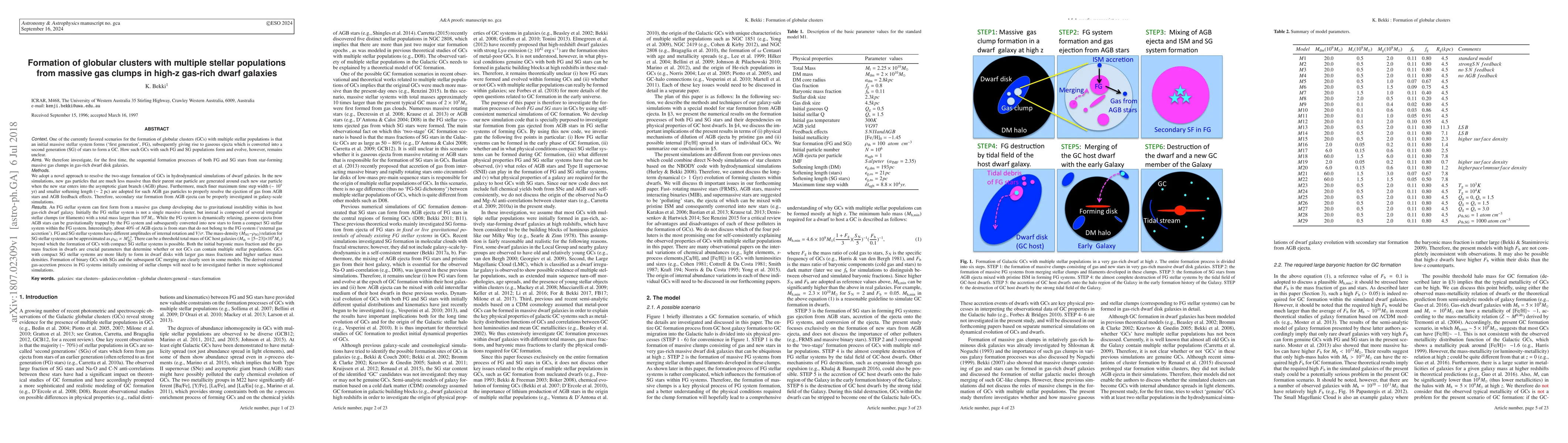 Research suggests that globular clusters with multiple stellar populations form from massive gas clumps in high-z gas-rich dwarf galaxies through a two-stage process involving initial star formation and gas ejection that fuels subsequent star formation.
