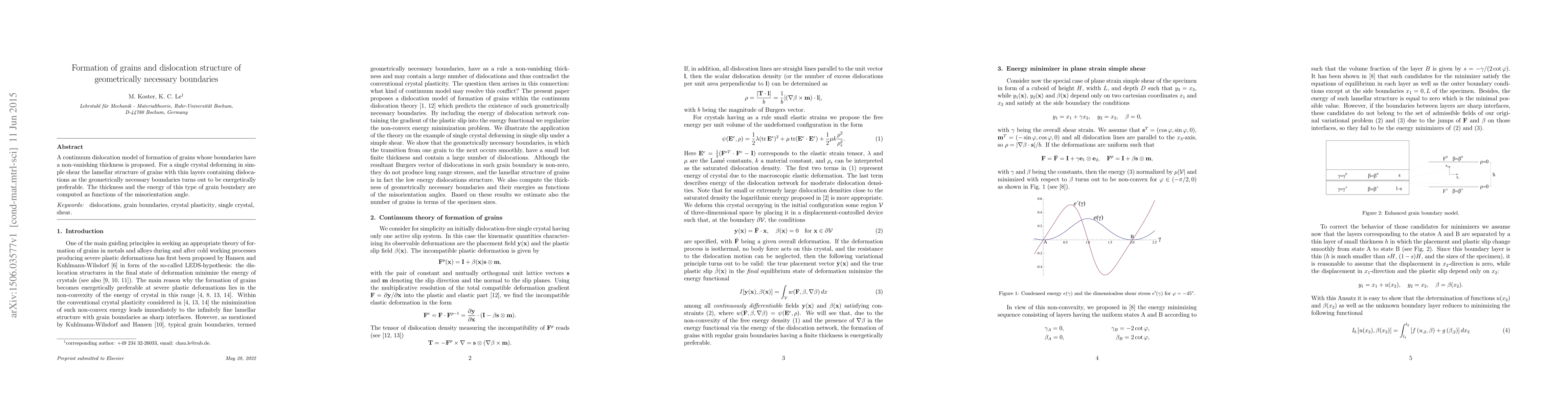 A continuum dislocation model of formation of grains whose boundaries have a non-vanishing thickness is proposed. For a single crystal deforming in simple shear the lamellar structure of grains with thin layers containing dislocations as the geometrically necessary boundaries turns out to be energetically preferable. The thickness and the energy of this type of grain boundary are computed as functions of the misorientation angle.