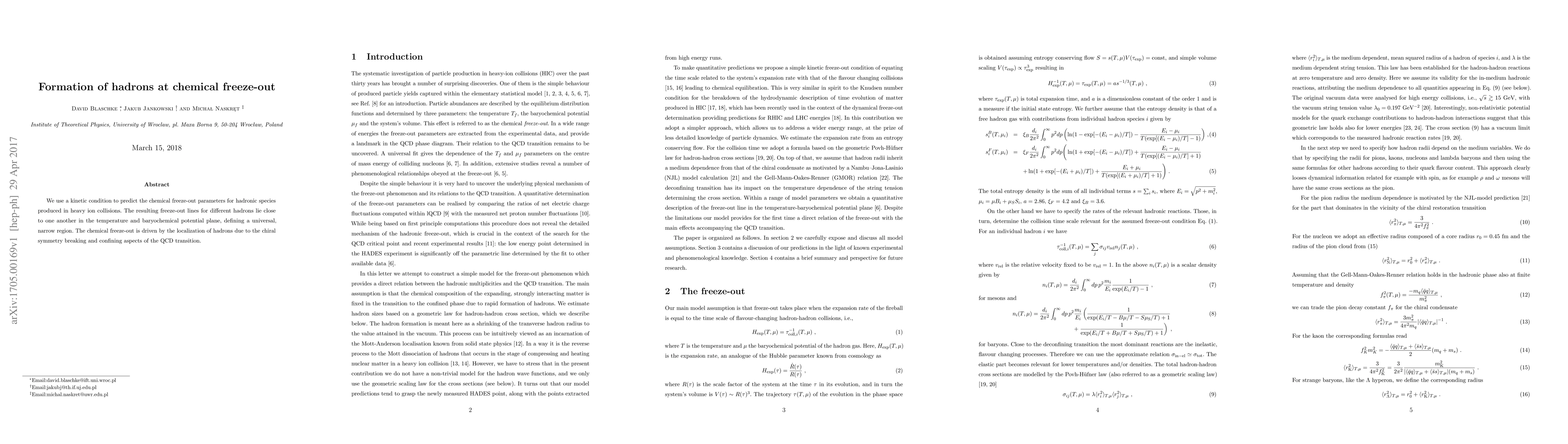 We use a kinetic condition to predict the chemical freeze-out parameters for hadronic species produced in heavy ion collisions. The resulting freeze-out lines for different hadrons lie close to one another in the temperature and baryochemical potential plane, defining a universal, narrow region. The chemical freeze-out is driven by the localization of hadrons due to the chiral symmetry breaking and confining aspects of the QCD transition.