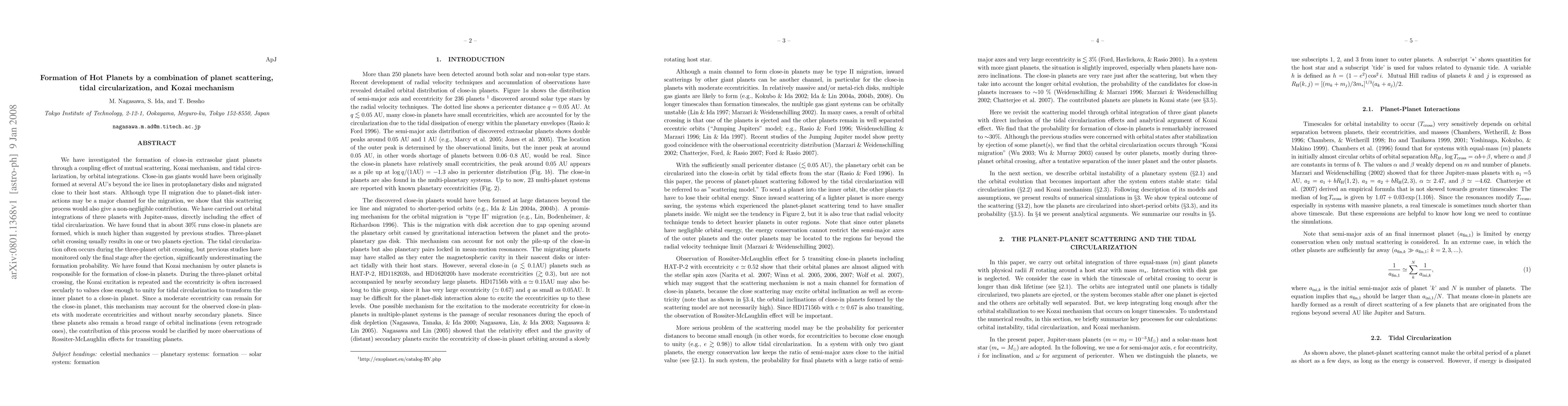 This study investigates the formation of close-in extrasolar giant planets through a combination of planet scattering, Kozai mechanism, and tidal circularization. The research found that 30% of simulations resulted in close-in planets, significantly higher than previous estimates, suggesting the Kozai mechanism by outer planets plays a crucial role in their formation.