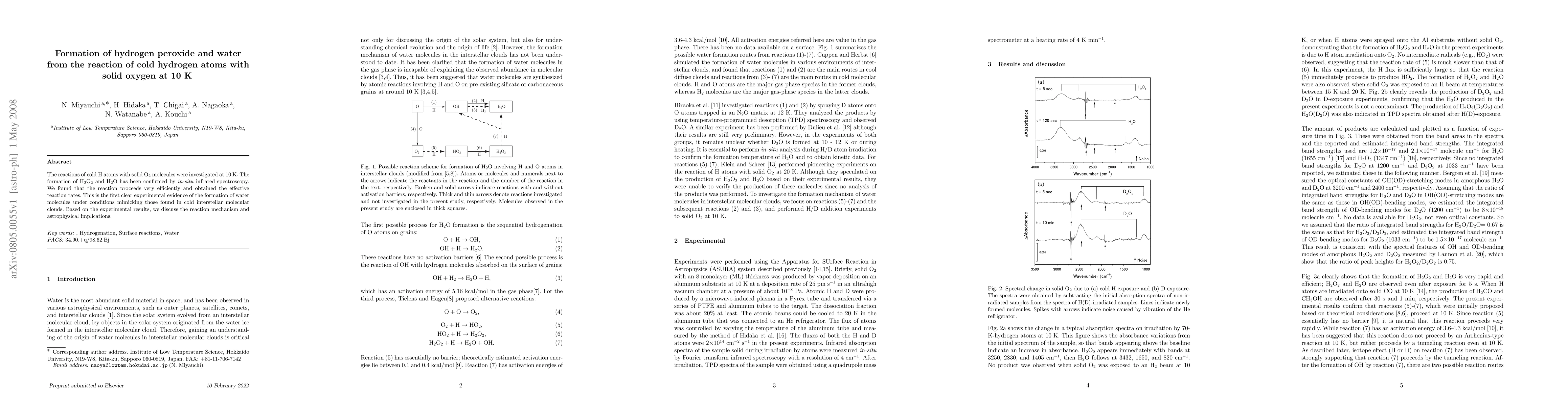 The study confirms the formation of hydrogen peroxide and water from cold hydrogen atoms reacting with solid oxygen at 10K using in-situ infrared spectroscopy, providing the first experimental evidence of water formation in conditions similar to cold interstellar molecular clouds. The research also discusses the reaction mechanism and its astrophysical implications.