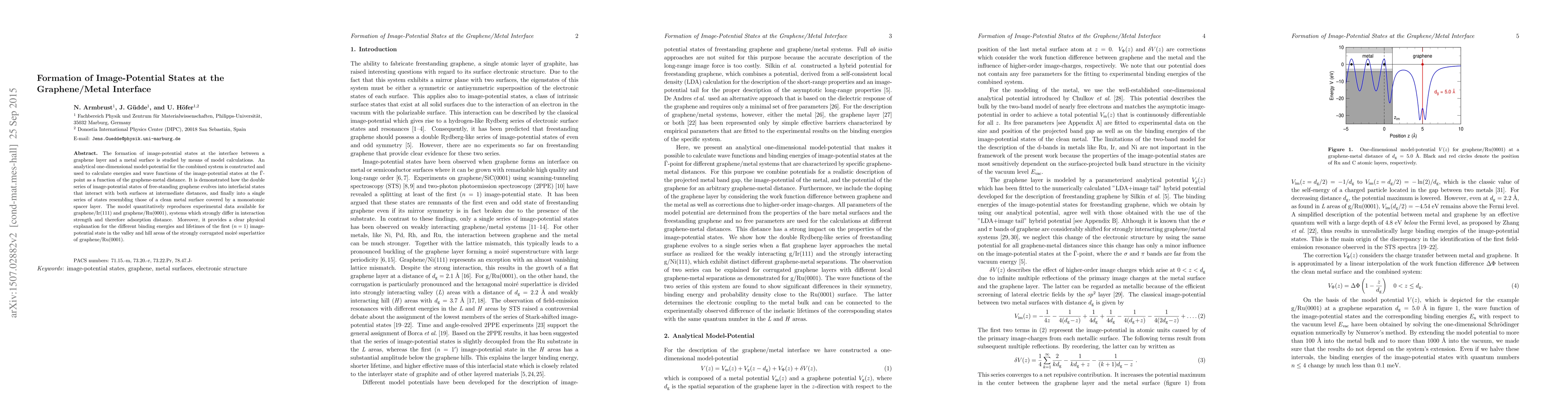 This paper investigates the formation of image-potential states at the graphene/metal interface using an analytical model, showing how these states evolve with distance and interact with both graphene and metal surfaces. The model accurately reproduces experimental data for graphene/Ir(111) and graphene/Ru(0001) systems, explaining the differing binding energies and lifetimes of the first image-potential state.
