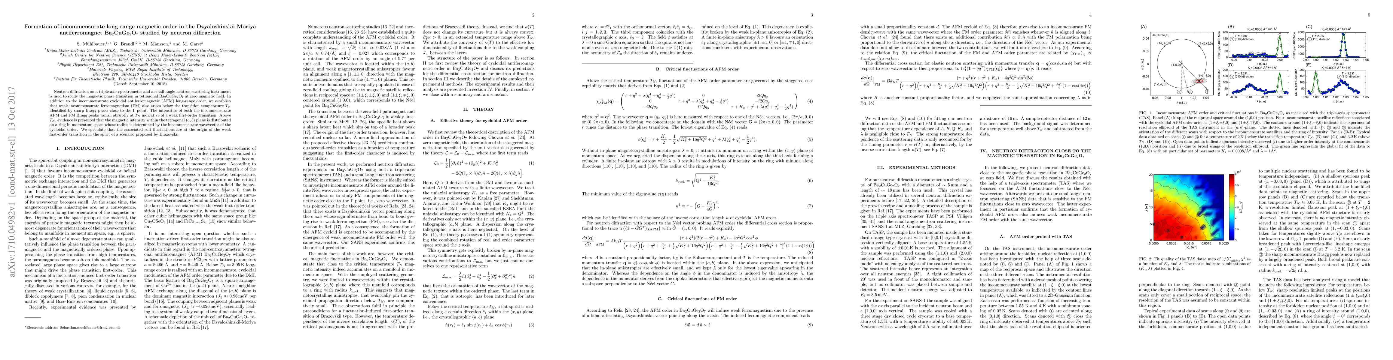 Neutron diffraction on a triple-axis spectrometer and a small-angle neutron scattering instrument is used to study the magnetic phase transition in tetragonal Ba$_2$CuGe$_2$O$_7$ at zero magnetic field. In addition to the incommensurate cycloidal antiferromagnetic (AFM) long-range order, we establish that weak incommensurate ferromagnetism (FM) also arises below the transition temperature $T_N$ identified by sharp Bragg peaks close to the $\Gamma$ point. The intensities of both the incommensurate AFM and FM Bragg peaks vanish abruptly at $T_N$ indicative of a weak first-order transition. Above $T_N$, evidence is presented that the magnetic intensity within the tetragonal $(a,b)$ plane is distributed on a ring in momentum space whose radius is determined by the incommensurate wavevector of the cycloidal order. We speculate that the associated soft fluctuations are at the origin of the weak first-order transition in the spirit of a scenario proposed by Brazovskii.
