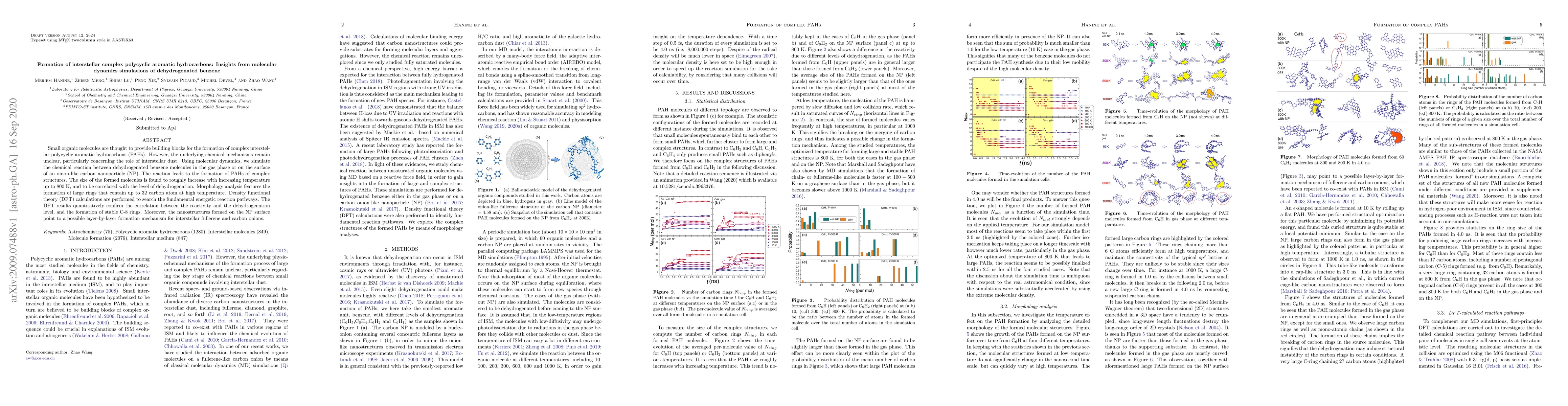 This research uses molecular dynamics simulations to explore the formation of complex interstellar polycyclic aromatic hydrocarbons (PAHs) from dehydrogenated benzene, revealing that higher temperatures and dehydrogenation levels promote the growth of large PAHs, including rings with up to 32 carbon atoms. Density functional theory (DFT) calculations support the proposed layer-by-layer formation mechanism for fullerene and carbon onions on nanoparticle surfaces.