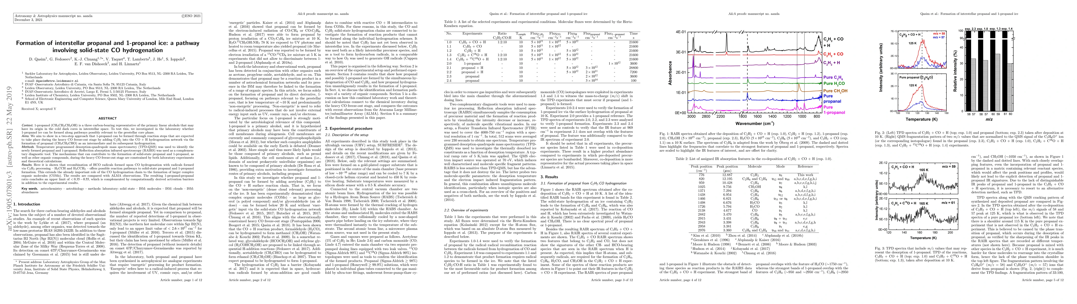 1-propanol (CH3CH2CH2OH) is a three carbon-bearing representative of primary linear alcohols that may have its origin in the cold dark cores in interstellar space. To test this, we investigated in the laboratory whether 1-propanol ice can be formed along pathways possibly relevant to the prestellar core phase. We aim to show in a two-step approach that 1-propanol can be formed through reaction steps that are expected to take place during the heavy CO freeze-out stage by adding C2H2 into the CO + H hydrogenation network via the formation of propanal (CH3CH2CHO) as an intermediate and its subsequent hydrogenation. Temperature programmed desorption-quadrupole mass spectrometry (TPD-QMS) is used to identify the newly formed propanal and 1-propanol. Reflection absorption infrared spectroscopy (RAIRS) is used as a complementary diagnostic tool. The mechanisms that can contribute to the formation of solid-state propanal and 1-propanol, as well as other organic compounds, during the heavy CO freeze-out stage are constrained by both laboratory experiments and theoretical calculations. Here it is shown that recombination of HCO radicals, formed upon CO hydrogenation, with radicals formed upon C2H2 processing - H2CCH and H3CCH2 - offers possible reaction pathways to solid-state propanal and 1-propanol formation. This extends the already important role of the CO hydrogenation chain in the formation of larger COMs (complex organic molecules). The results are used to compare with ALMA observations. The resulting 1-propanol:propanal ratio concludes an upper limit of < 0:35-0:55, which is complemented by computationally-derived activation barriers in addition to the experimental results.