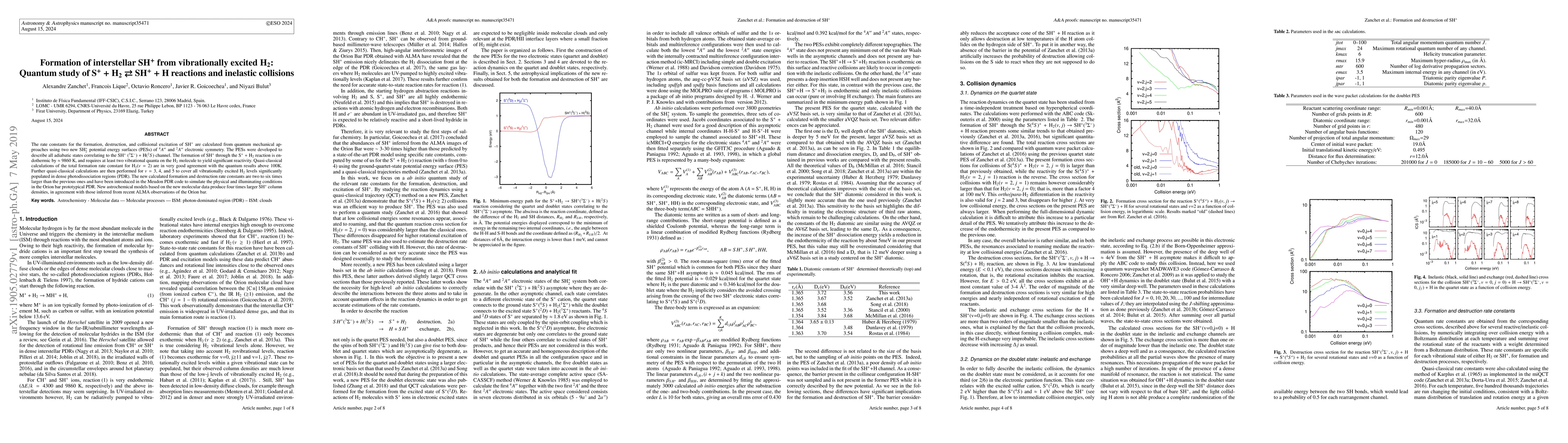 The rate constants for the formation, destruction, and collisional excitation of SH$^+$ are calculated from quantum mechanical approaches using two new SH$_2^+$ potential energy surfaces (PESs) of $^4A''$ and $^2A''$ electronic symmetry. The PESs were developed to describe all adiabatic states correlating to the SH$^+$ ($^3\Sigma^-$) + H($^2S$) channel. The formation of SH$^+$ through the S$^+$ + H$_2$ reaction is endothermic by $\approx$ 9860 K, and requires at least two vibrational quanta on the H$_2$ molecule to yield significant reactivity. Quasi-classical calculations of the total formation rate constant for H$_2$($v=2$) are in very good agreement with the quantum results above 100K. Further quasi-classical calculations are then performed for $v=3$, 4, and 5 to cover all vibrationally excited H$_2$ levels significantly populated in dense photodissociation regions (PDR). The new calculated formation and destruction rate constants are two to six times larger than the previous ones and have been introduced in the Meudon PDR code to simulate the physical and illuminating conditions in the Orion bar prototypical PDR. New astrochemical models based on the new molecular data produce four times larger SH$^+$ column densities, in agreement with those inferred from recent ALMA observations of the Orion bar.