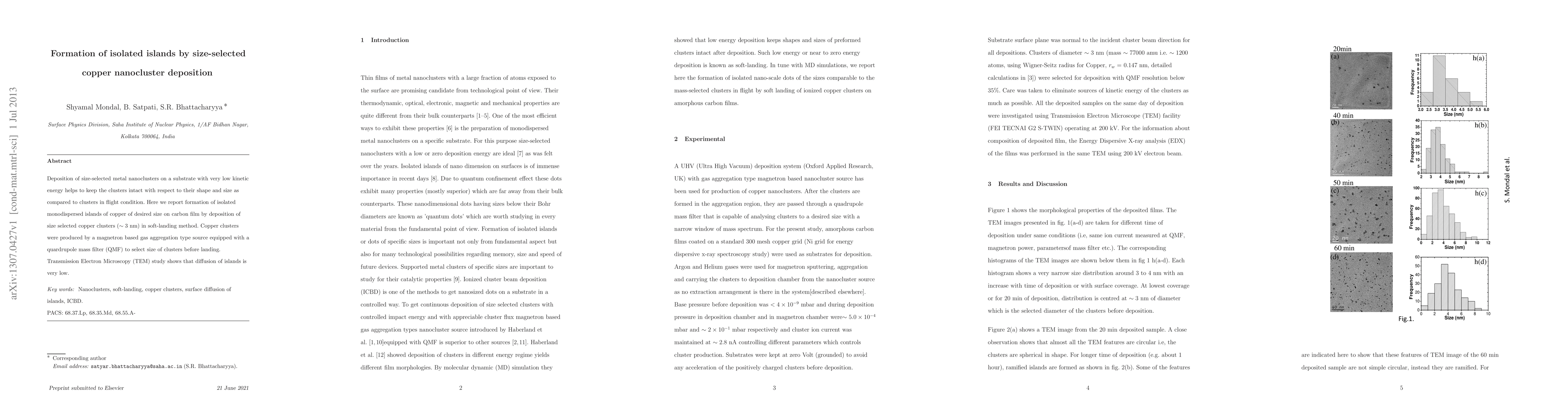 This study reports the formation of isolated, monodispersed copper islands of desired size (~3 nm) on a carbon film using size-selected copper nanoclusters deposited via a soft-landing method. The clusters were produced and size-selected using a magnetron-based gas aggregation source with a quadrupole mass filter.