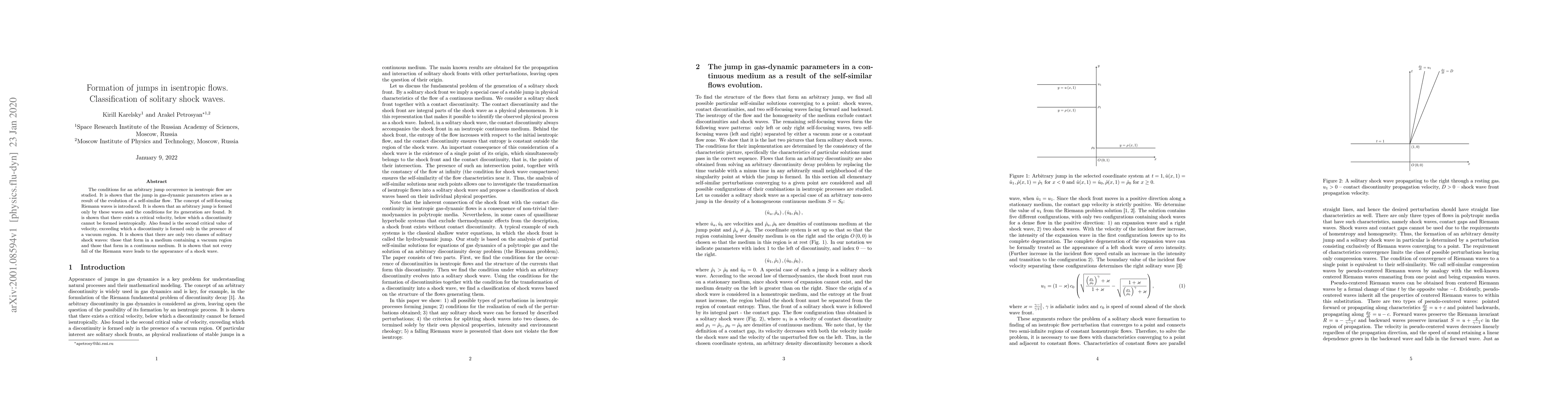 This research identifies conditions for jump formation in isentropic flows, introducing self-focusing Riemann waves. It establishes critical velocity thresholds for discontinuity formation and classifies solitary shock waves into two types based on medium continuity. The study reveals that not all Riemann wave collapses result in shock waves.
