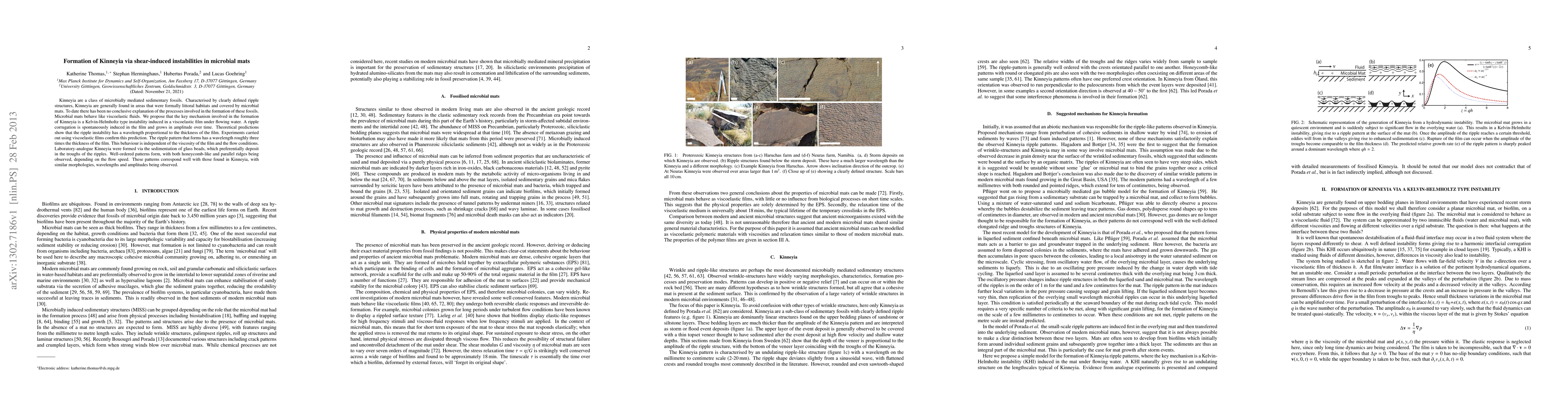 This research proposes that Kinneyia, a type of microbial fossil, form via a Kelvin-Helmholtz instability in viscoelastic microbial mats under flowing water. Experiments confirm ripple patterns matching Kinneyia, formed by sedimentation in the troughs of these ripples, regardless of film viscosity or flow conditions.