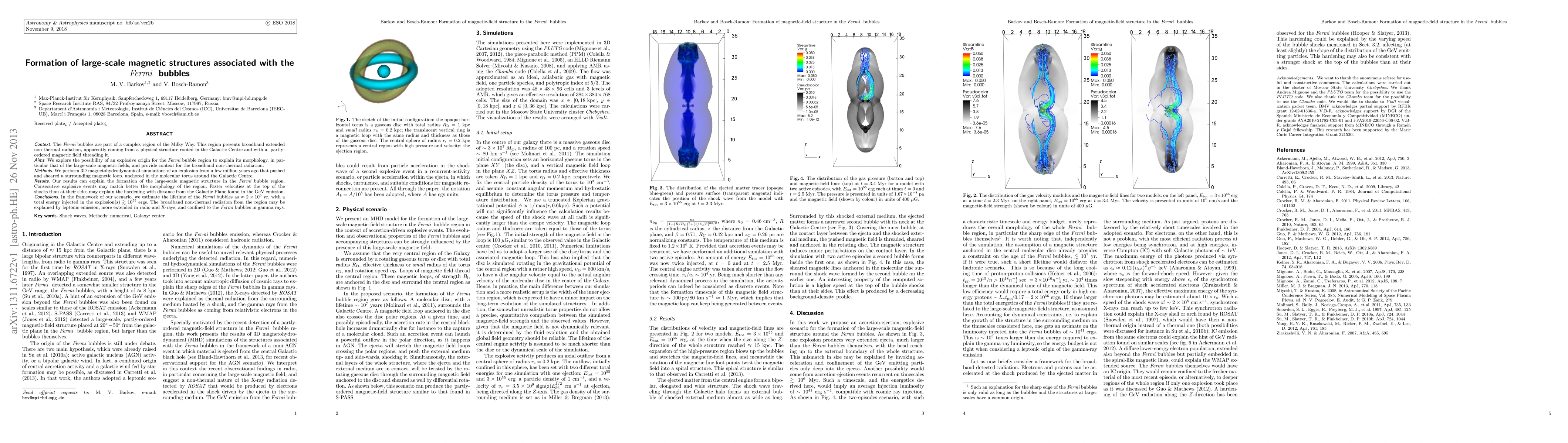 The Fermi bubbles are part of a complex region of the Milky Way. This region presents broadband extended non-thermal radiation, apparently coming from a physical structure rooted in the Galactic Centre and with a partly-ordered magnetic field threading it. We explore the possibility of an explosive origin for the Fermi bubble region to explain its morphology, in particular that of the large-scale magnetic fields, and provide context for the broadband non-thermal radiation. We perform 3D magnetohydrodynamical simulations of an explosion from a few million years ago that pushed and sheared a surrounding magnetic loop, anchored in the molecular torus around the Galactic Centre. Our results can explain the formation of the large-scale magnetic structure in the Fermi bubble region. Consecutive explosive events may match better the morphology of the region. Faster velocities at the top of the shocks than at their sides may explain the hardening with distance from the Galactic Plane found in the GeV emission. In the framework of our scenario, we estimate the lifetime of the Fermi bubbles as $2\times10^6$ yr, with a total energy injected in the explosion(s) $> 10^{55}$ ergs. The broadband non-thermal radiation from the region may be explained by leptonic emission, more extended in radio and X-rays, and confined to the Fermi bubbles in gamma rays.