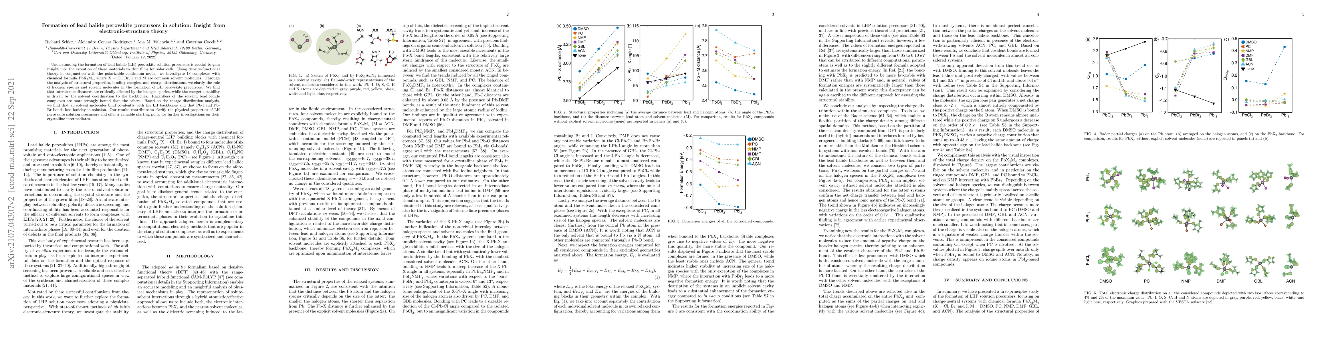 This study uses density-functional theory to investigate the formation of lead halide perovskite solution precursors, revealing that interatomic distances are influenced by halogen species while solvent coordination affects energetic stability. Lead iodide complexes show stronger binding, and solvent molecules bind covalently with the perovskite backbone, losing ionicity in solution.