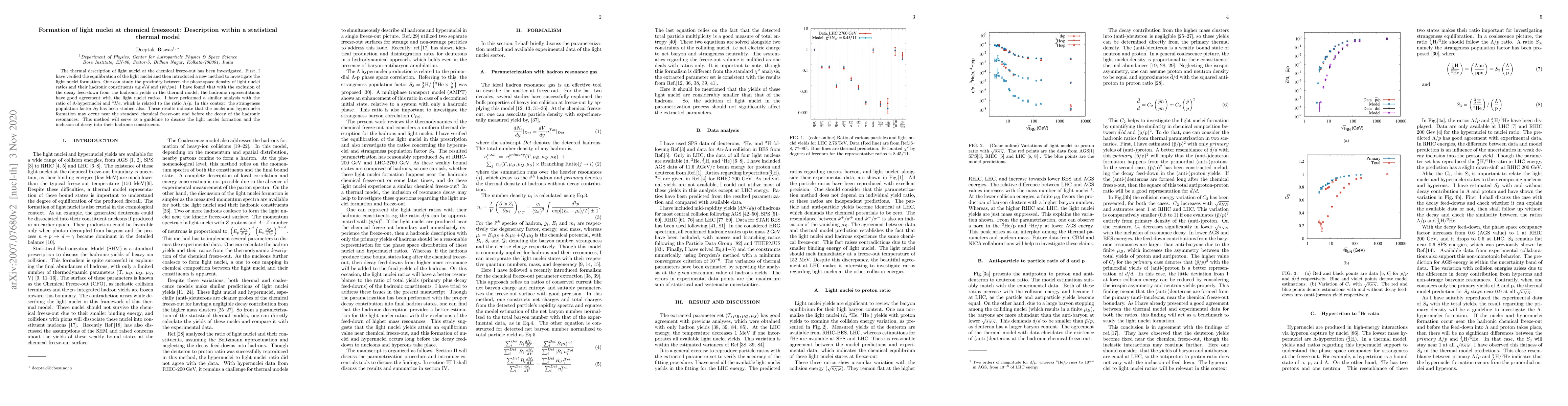 The thermal description of light nuclei at the chemical freeze-out has been investigated. First, I have verified the equilibration of the light nuclei and then introduced a new method to investigate the light nuclei formation. One can study the proximity between the phase space density of light nuclei ratios and their hadronic constituents e.g $\bar{d}/d$ and $(\bar{p}\bar{n}/pn)$. I have found that with the exclusion of the decay feed-down from the hadronic yields in the thermal model, the hadronic representations have good agreement with the light nuclei ratios. I have performed a similar analysis with the ratio of $\Lambda$-hypernuclei and $^3 He$, which is related to the ratio $\Lambda/p$. In this context, the strangeness population factor $S_3$ has been studied also. These results indicate that the nuclei and hypernuclei formation may occur near the standard chemical freeze-out and before the decay of the hadronic resonances. This method will serve as a guideline to discuss the light nuclei formation and the inclusion of decay into their hadronic constituents.