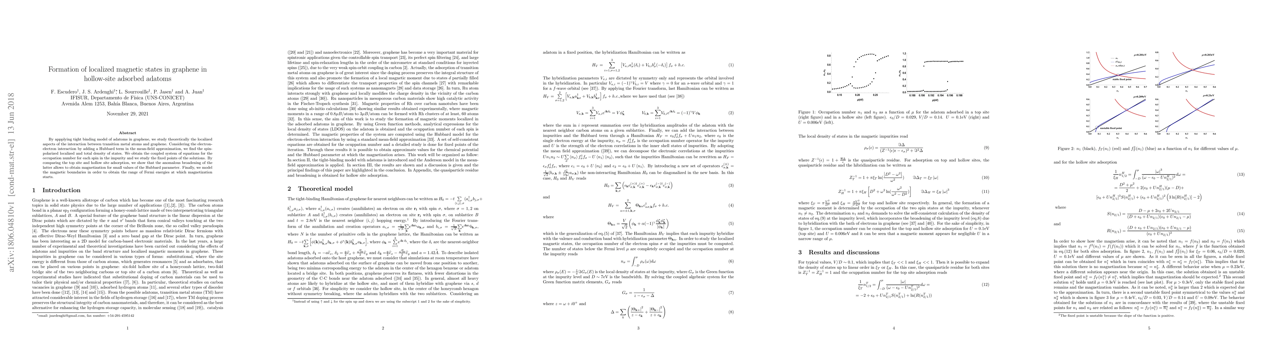 This paper theoretically investigates the localized magnetic states in graphene when transition metal adatoms are adsorbed in hollow sites using a tight binding model and mean-field approximation. It finds that anomalous broadening at hollow sites enables magnetization for small Hubbard parameters, and models magnetic boundaries to determine the onset of magnetization at specific Fermi energies.