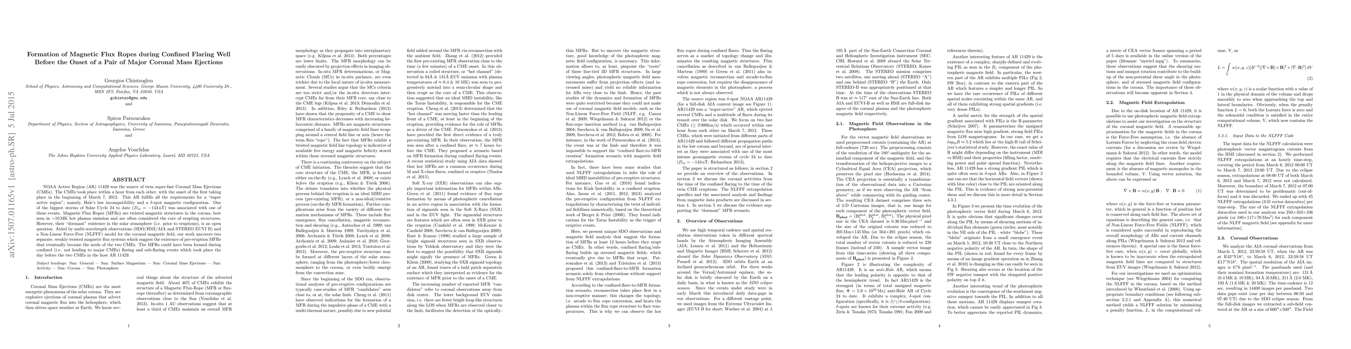 NOAA Active Region (AR) 11429 was the source of twin super-fast Coronal Mass Ejections (CMEs). The CMEs took place within a hour from each other, with the onset of the first taking place in the beginning of March 7, 2012. This AR fulfills all the requirements for a "super active region"; namely, Hale's law incompatibility and a $\delta$-spot magnetic configuration. One of the biggest storms of Solar Cycle 24 to date ($D_{st}=-143$ nT) was associated with one of these events. Magnetic Flux Ropes (MFRs) are twisted magnetic structures in the corona, best seen in $\sim$10 MK hot plasma emission and are often considered the core of erupting structures. However, their "dormant" existence in the solar atmosphere (i.e. prior to eruptions), is an open question. Aided by multi-wavelength observations (SDO/HMI/AIA and STEREO EUVI B) and a Non-Linear Force-Free (NLFFF) model for the coronal magnetic field, our work uncovers two separate, weakly-twisted magnetic flux systems which suggest the existence of pre-eruption MFRs that eventually became the seeds of the two CMEs. The MFRs could have been formed during confined (i.e. not leading to major CMEs) flaring and sub-flaring events which took place the day before the two CMEs in the host AR 11429.