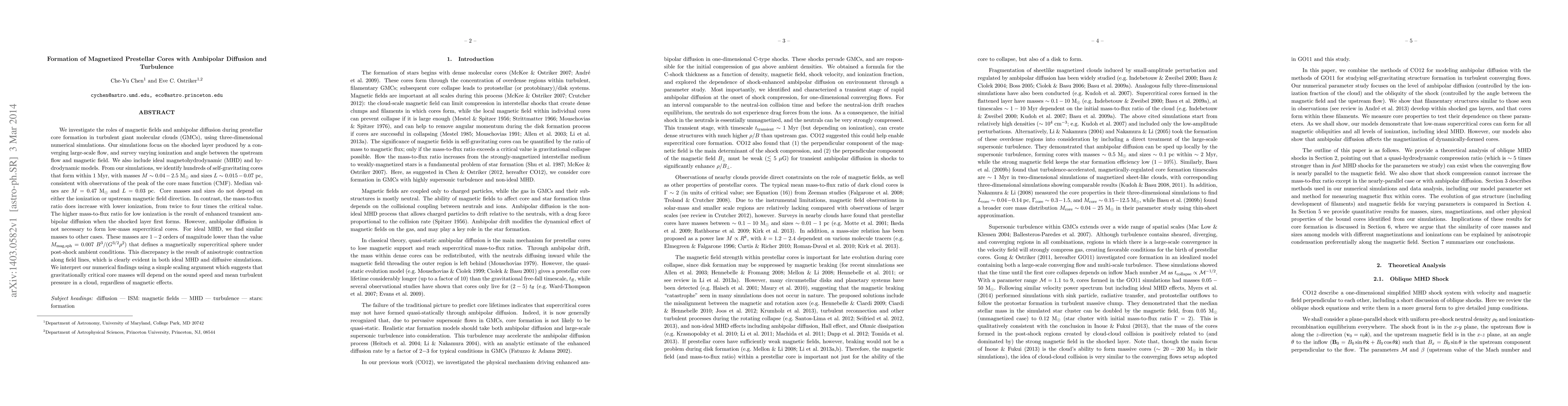 We investigate the roles of magnetic fields and ambipolar diffusion during prestellar core formation in turbulent giant molecular clouds (GMCs), using three-dimensional numerical simulations. Our simulations focus on the shocked layer produced by a converging flow within a GMC, and survey varying ionization and angle between the upstream flow and magnetic field. We also include ideal magnetohydrodynamic (MHD) and hydrodynamic models. From our simulations, we identify hundreds of self-gravitating cores that form within 1 Myr, with masses M ~ 0.04 - 2.5 solar-mass and sizes L ~ 0.015 - 0.07 pc, consistent with observations of the peak of the core mass function (CMF). Median values are M = 0.47 solar-mass and L = 0.03 pc. Core masses and sizes do not depend on either the ionization or upstream magnetic field direction. In contrast, the mass-to-magnetic flux ratio does increase with lower ionization, from twice to four times the critical value. The higher mass-to-flux ratio for low ionization is the result of enhanced transient ambipolar diffusion when the shocked layer first forms. However, ambipolar diffusion is not necessary to form low-mass supercritical cores. For ideal MHD, we find similar masses to other cases. These masses are 1 - 2 orders of magnitude lower than the value that defines a magnetically supercritical sphere under post-shock ambient conditions. This discrepancy is the result of anisotropic contraction along field lines, which is clearly evident in both ideal MHD and diffusive simulations. We interpret our numerical findings using a simple scaling argument which suggests that gravitationally critical core masses will depend on the sound speed and mean turbulent pressure in a cloud, regardless of magnetic effects.