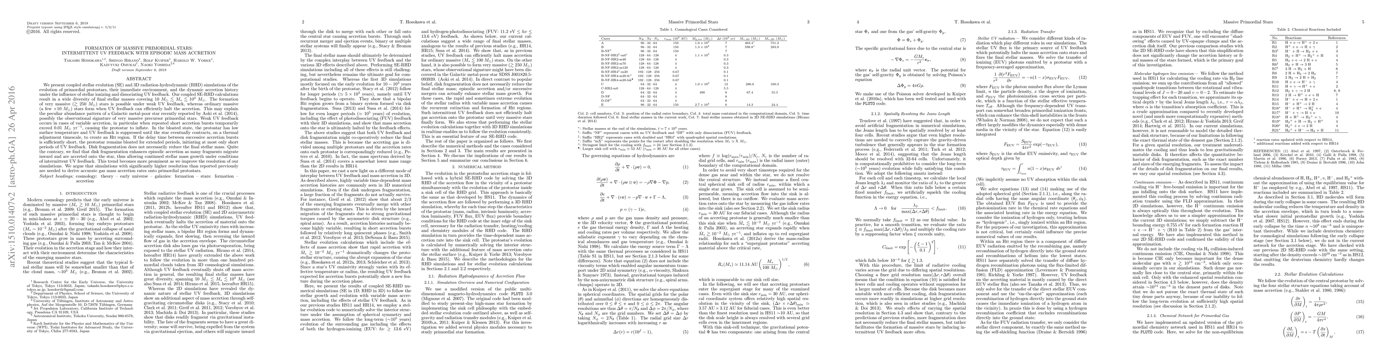 This paper uses coupled stellar evolution and 3D radiation-hydrodynamic simulations to explore the formation of massive primordial stars, showing that intermittent UV feedback and episodic mass accretion can lead to the formation of stars with masses ranging from 10 to 1000 solar masses. The study suggests that weak UV feedback, driven by variable accretion bursts, can result in the formation of very massive stars, potentially explaining peculiar abundance patterns in metal-poor Galactic stars.