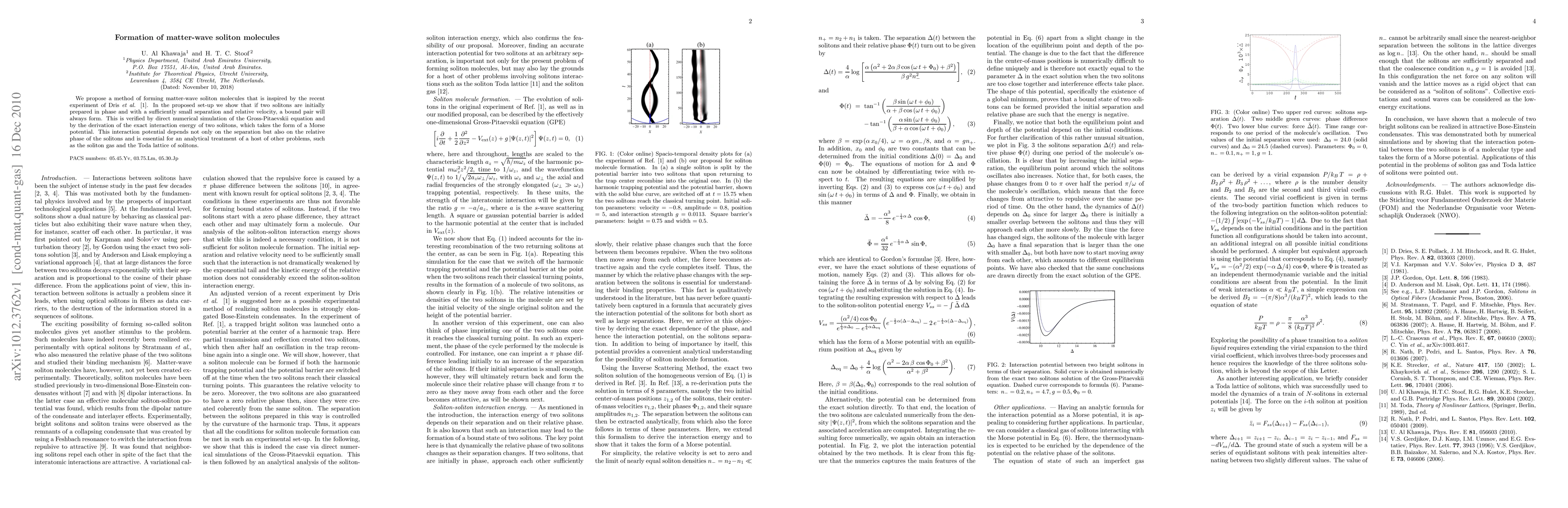 We propose a method of forming matter-wave soliton molecules that is inspired by the recent experiment of Dris {\it et al.}. In the proposed set-up we show that if two solitons are initially prepared in phase and with a sufficiently small separation and relative velocity, a bound pair will always form. This is verified by direct numerical simulation of the Gross-Pitaevskii equation and by the derivation of the exact interaction energy of two solitons, which takes the form of a Morse potential. This interaction potential depends not only on the separation but also on the relative phase of the solitons and is essential for an analytical treatment of a host of other problems, such as the soliton gas and the Toda lattice of solitons.