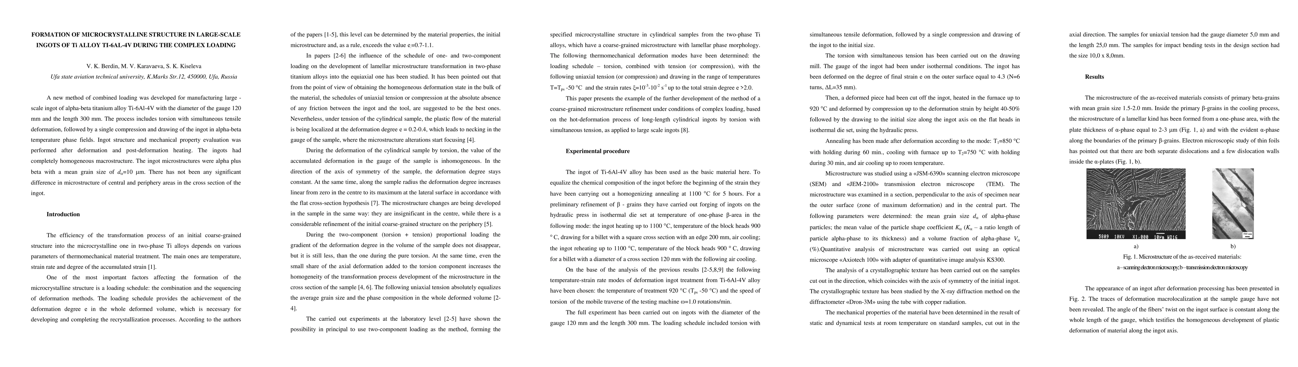 A new method of combined loading was developed for manufacturing large - scale ingot of alpha-beta titanium alloy Ti-6Al-4V with the diameter of the gauge 120 mm and the length 300 mm. The process includes torsion with simultaneous tensile deformation, followed by a single compression and drawing of the ingot in alpha-beta temperature phase fields. Ingot structure and mechanical property evaluation was performed after deformation and post-deformation heating. The ingots had completely homogeneous macrostructure. The ingot microstructures were alpha plus beta with a mean grain size of d=10 m. There has not been any significant difference in microstructure of central and periphery areas in the cross section of the ingot.