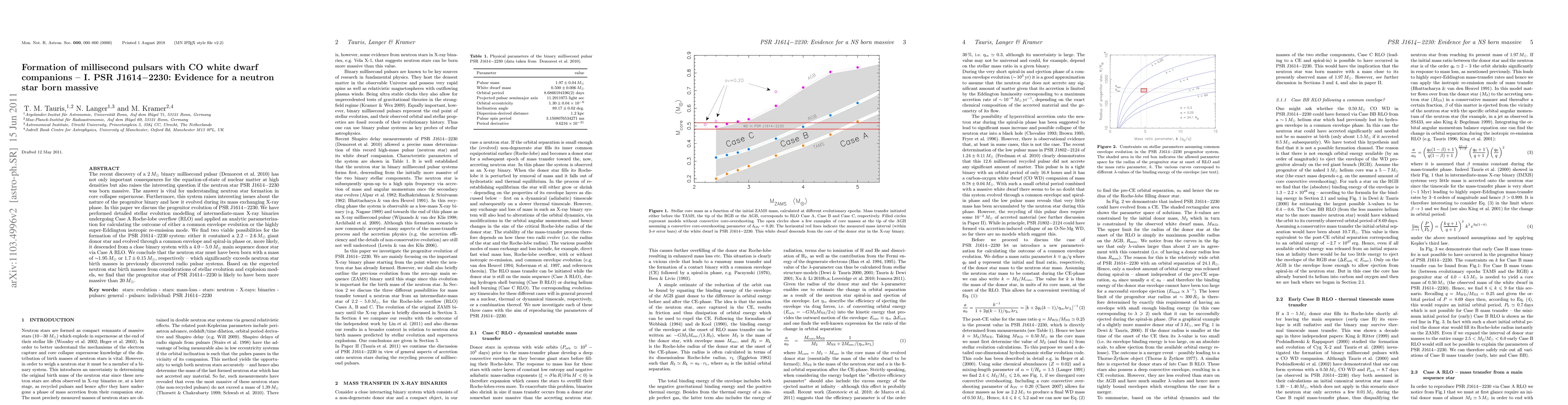 This paper investigates the formation of PSR J1614-2230, a millisecond pulsar with a CO white dwarf companion, finding it likely originated from a progenitor star exceeding 20 M_sun. The neutron star likely formed massive, challenging conventional neutron star birth mass models.