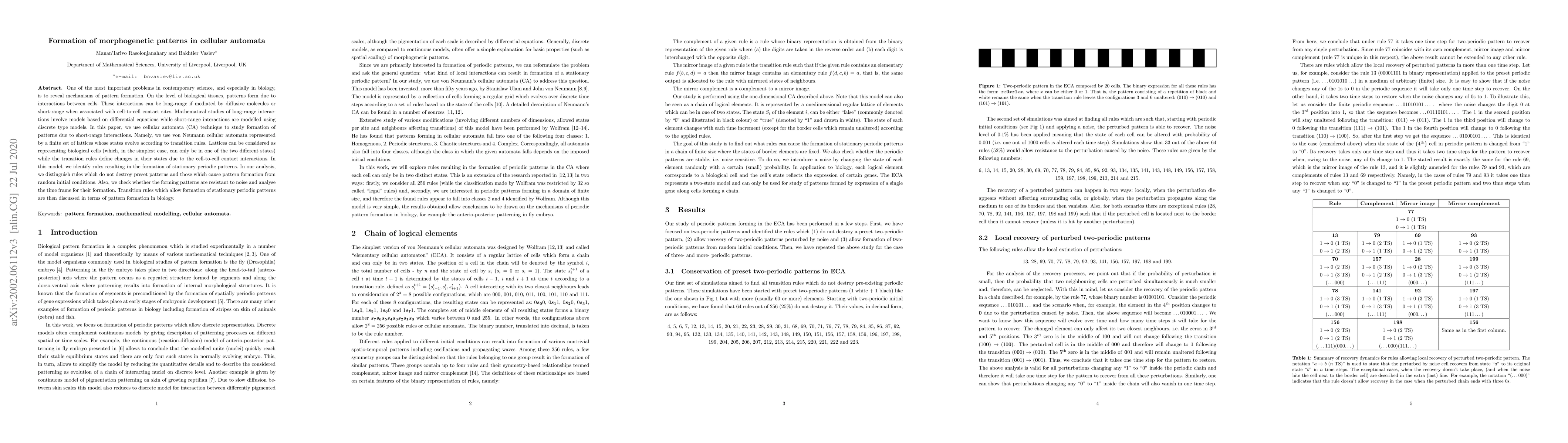 This paper explores the formation of morphogenetic patterns in cellular automata, specifically using von Neumann cellular automata to model short-range cell-to-cell interactions. The study identifies transition rules that generate stationary periodic patterns and analyzes their stability against noise and the time frame for pattern emergence.