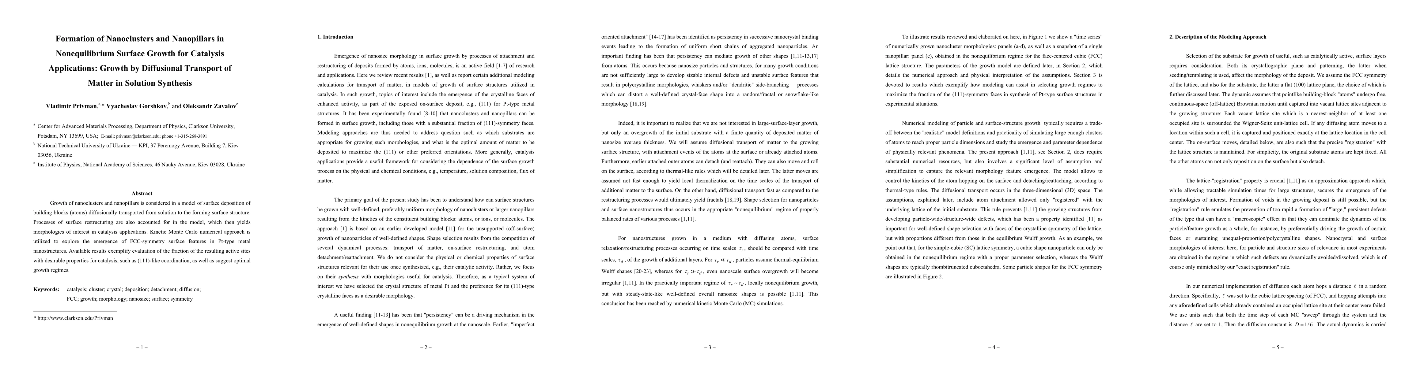 Growth of nanoclusters and nanopillars is considered in a model of surface deposition of building blocks (atoms) diffusionally transported from solution to the forming surface structure. Processes of surface restructuring are also accounted for in the model, which then yields morphologies of interest in catalysis applications. Kinetic Monte Carlo numerical approach is utilized to explore the emergence of FCC-symmetry surface features in Pt-type metal nanostructures. Available results exemplify evaluation of the fraction of the resulting active sites with desirable properties for catalysis, such as (111)-like coordination, as well as suggest optimal growth regimes.